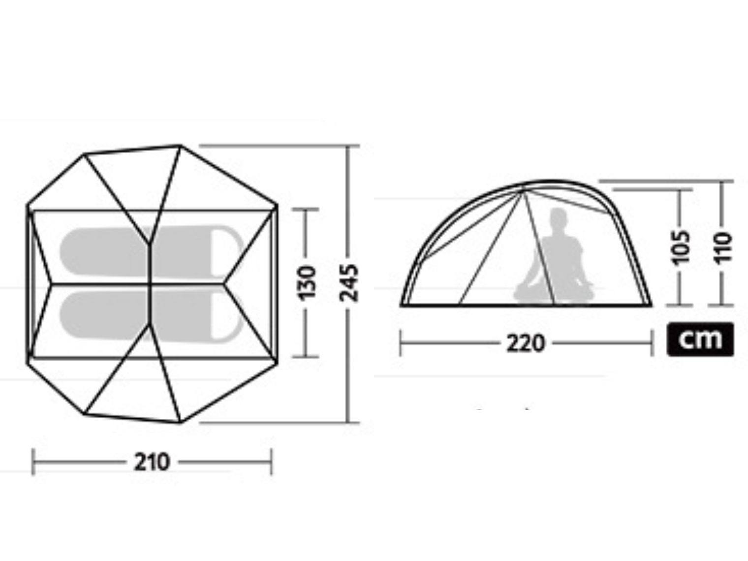 Намет швидко встановлюється, а у складеному вигляді займає лише Ø13 х 40 см. У конструкції передбачені 2 окремі входи, 2 тамбури для зберігання спорядження та 2 вентиляційні віконця.