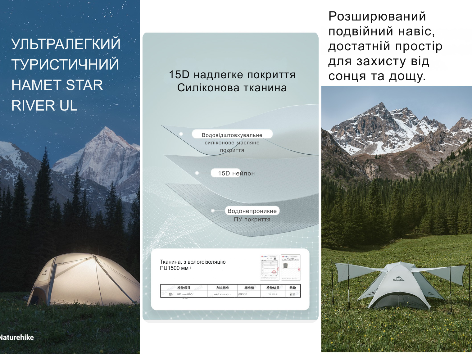 Намет Naturehike Star River демонструє високу стійкість до погодних умов. Це досягається внаслідок застосування надміцних матеріалів, які захищають від вологи, вітру та сонячних променів: