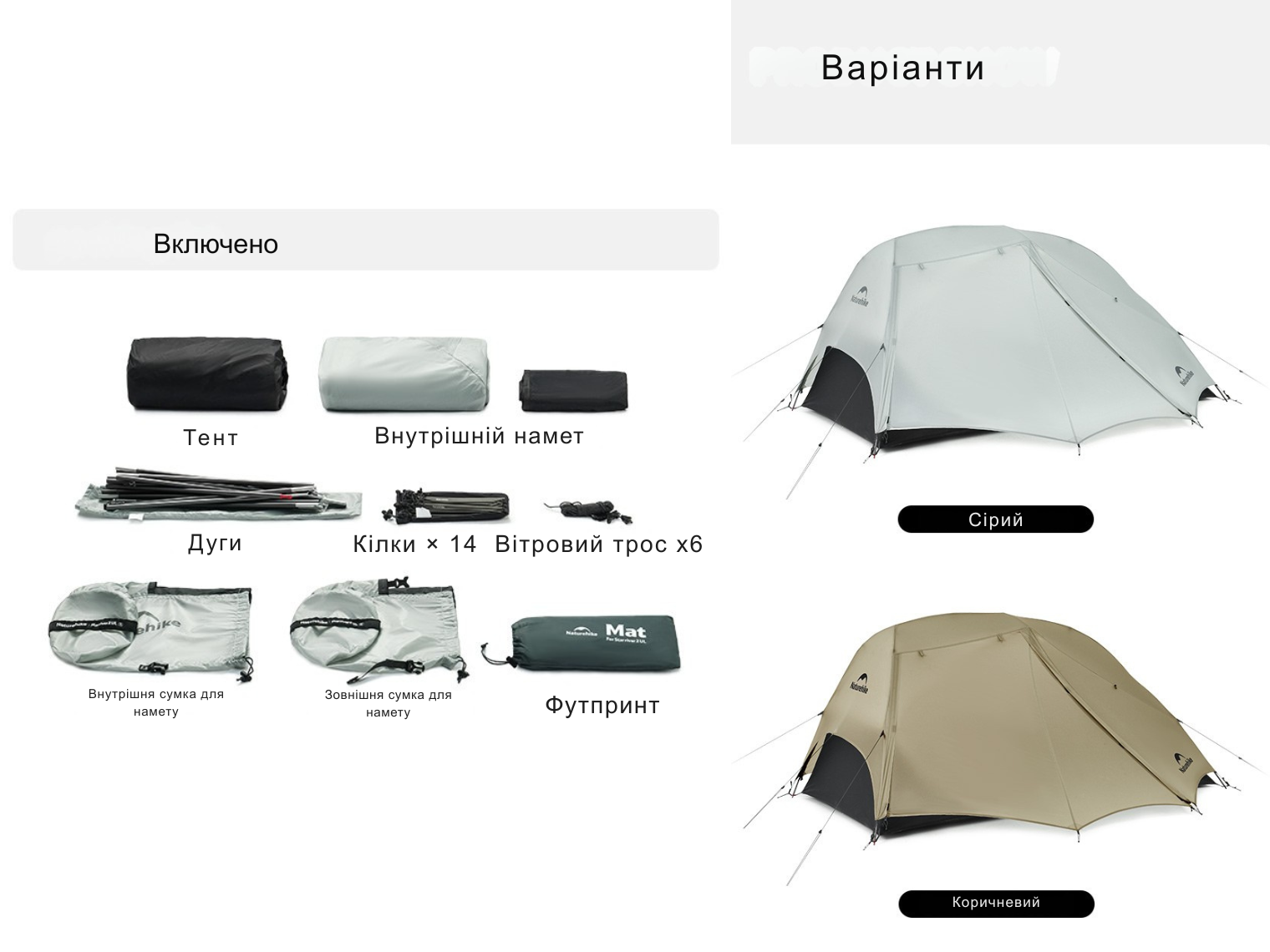 Внутрішній намет, зовнішній тент, дуги каркаса, нейлонові вітровідтяжки (6 шт.), алюмінієві кілочки (14 шт.), футпринт, чохли для зберігання (3 шт.).