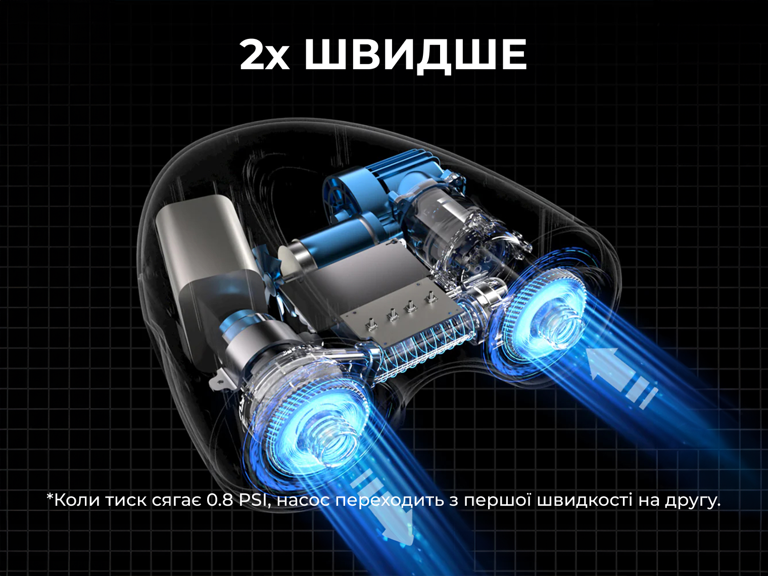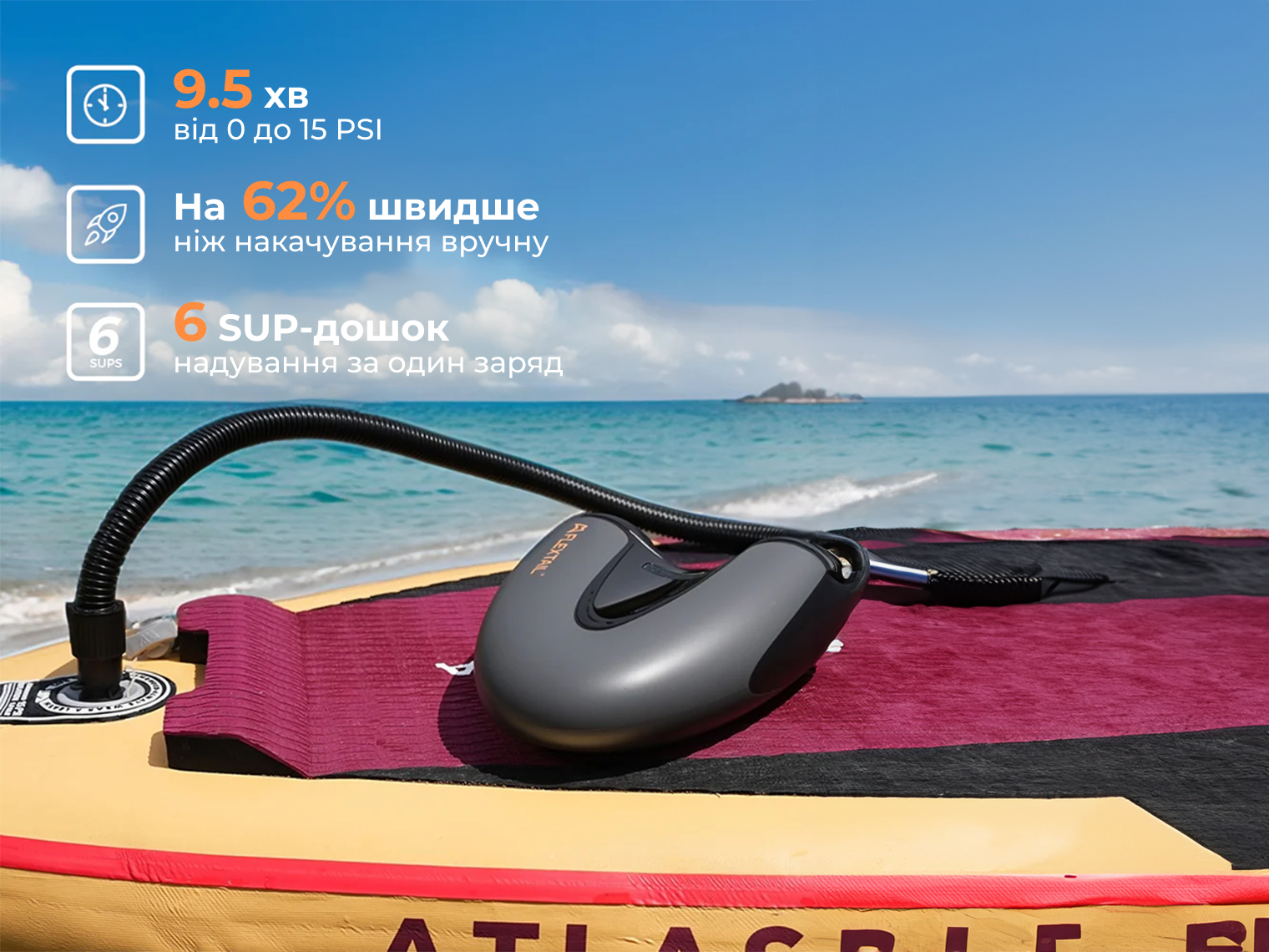 - Двоступенева система (Auto Dual Stage). На першому етапі пристрій працює як турбіна (360 л/хв) для швидкого заповнення об'єму, а на другому — як компресор (90 л/хв) для досягнення високого тиску. Це дає змогу надути стандартну SUP-дошку до 15 PSI всього за 9.5 хвилин.