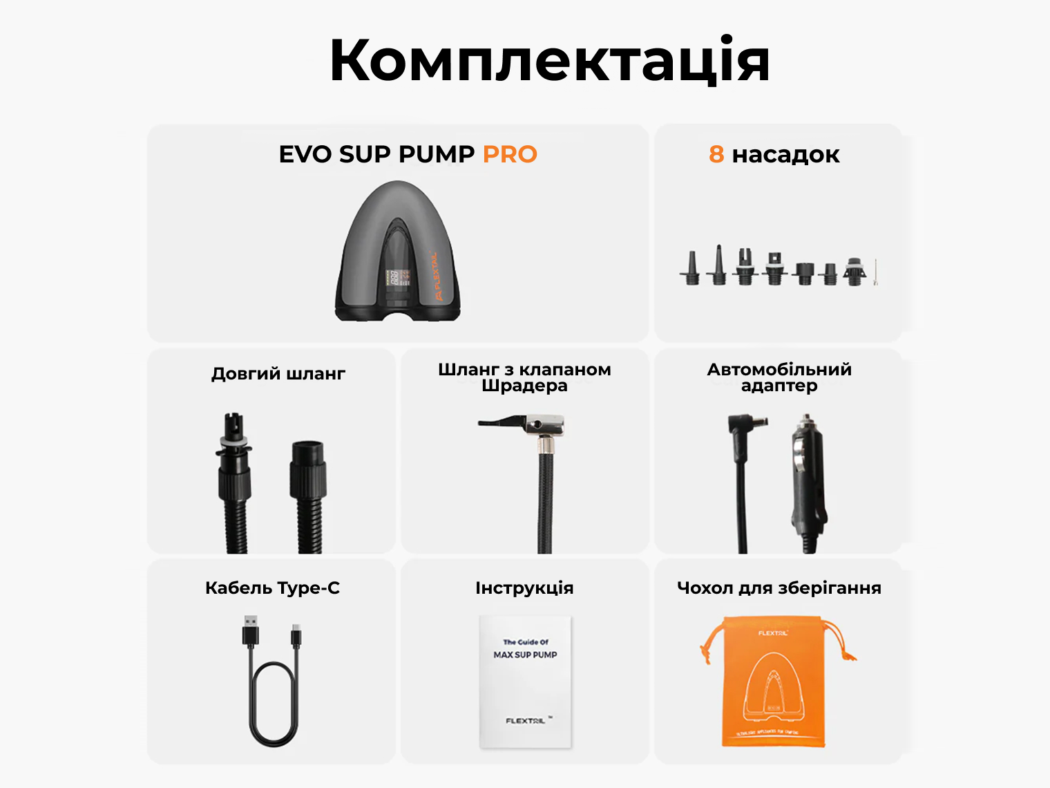 Насос Flextail EVO SUP PUMP PRO, 8 різних насадок-перехідників, довгий гнучкий шланг, спеціальний шланг для шин (Schrader), кабель для зарядки USB-C, автомобільний кабель (12V), сумка для транспортування, інструкція.