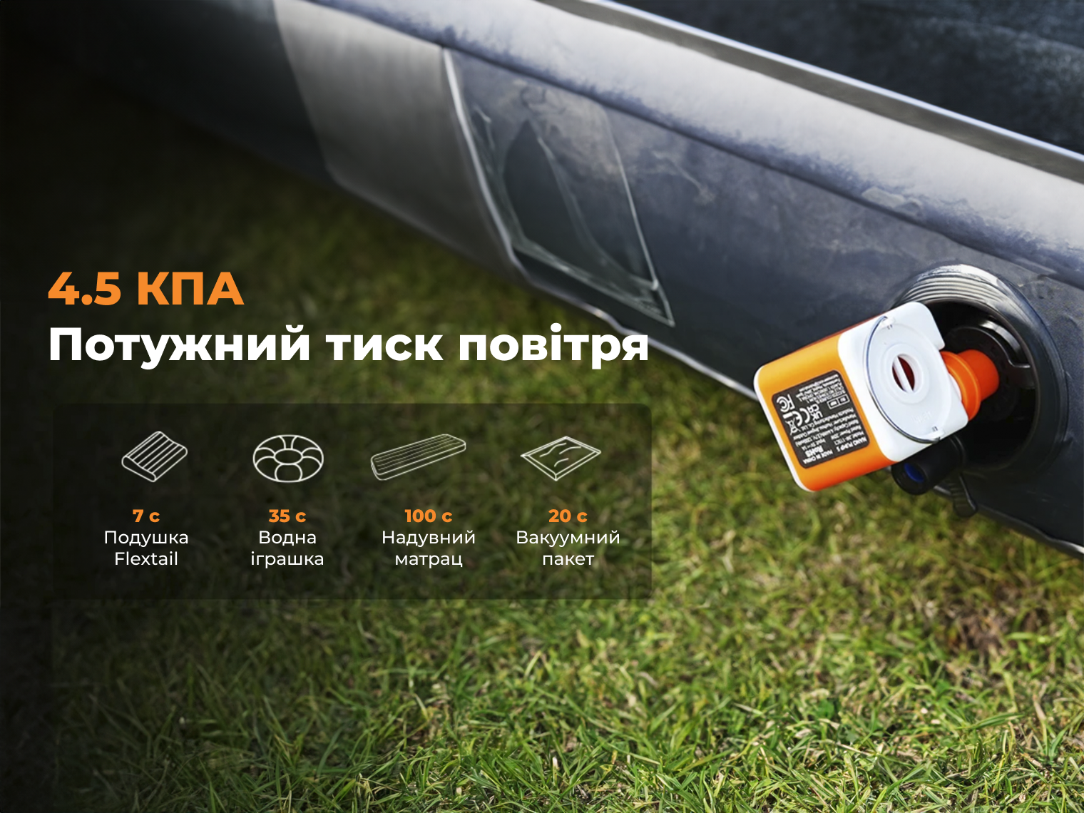 - Висока потужність у мініатюрному корпусі. Тиск 4.5 кПа гарантує щільне накачування виробів. На підготовку надувної подушки витрачається лише 7 с, а великої водної іграшки — 35 с.