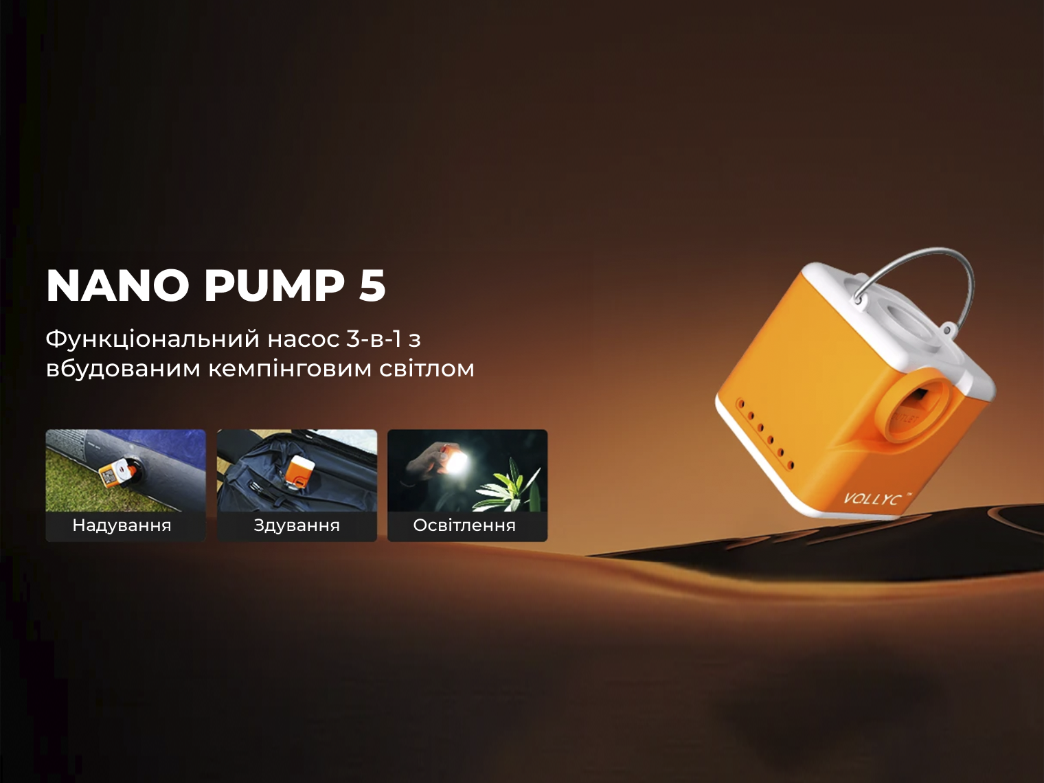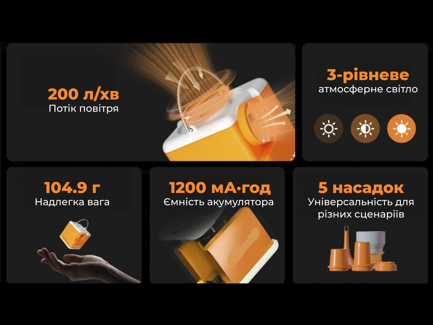 - тип — портативний акумуляторний насос 5 в 1: надування, викачування, вакуум, ліхтар та очищення;