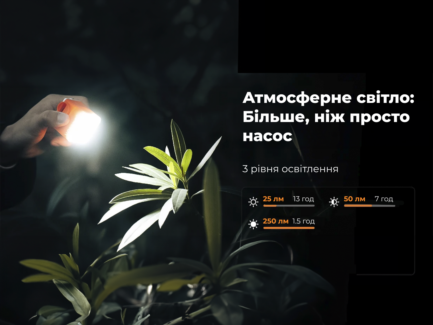 - 3-рівневе кемпінгове освітлення. Вбудований ліхтар працює в трьох режимах яскравості: 25 лм, 50 лм та 250 лм. Максимального рівня достатньо для освітлення всього намету.