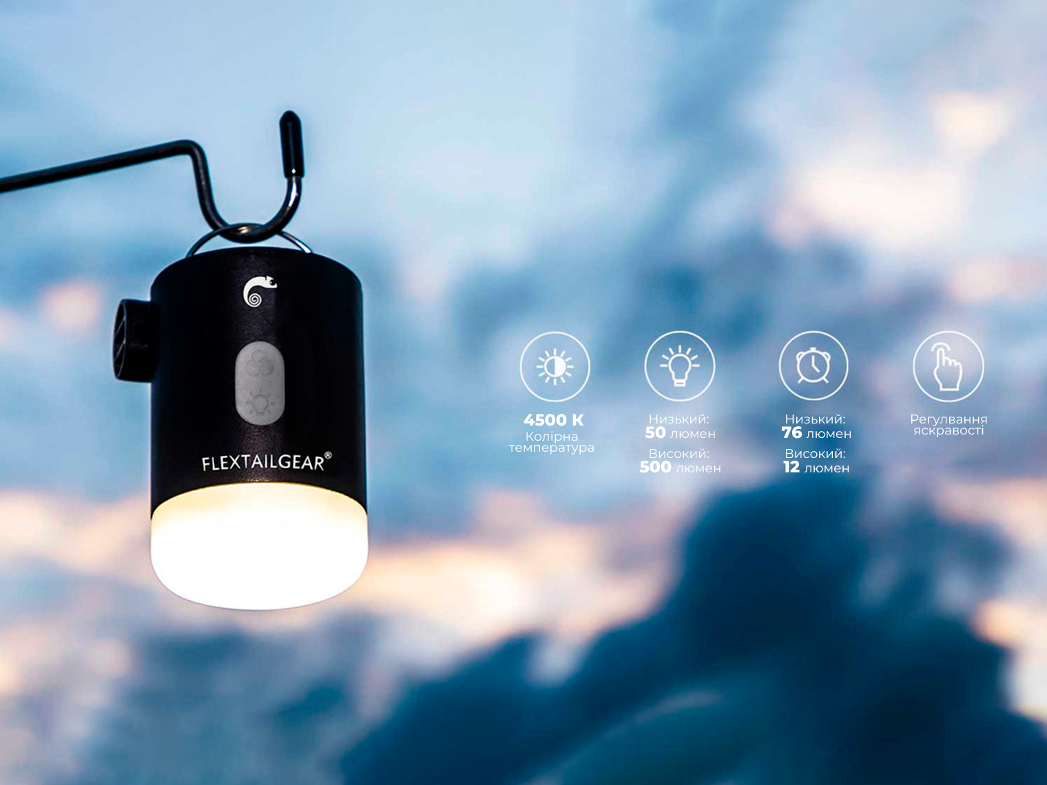- Кемпінговий ліхтар. Яскравість променя регулюється в межах 50-500 люмен, а колірна температура знаходиться на рівні 4500К. Це нейтральне біле світло, яке не засліплює при активації та не втомлює очі. Ліхтар безперебійно світить до 76 год на одному заряді в режимі тьмяного світла та може підвішуватися над місцем відпочинку за металеву ручку.