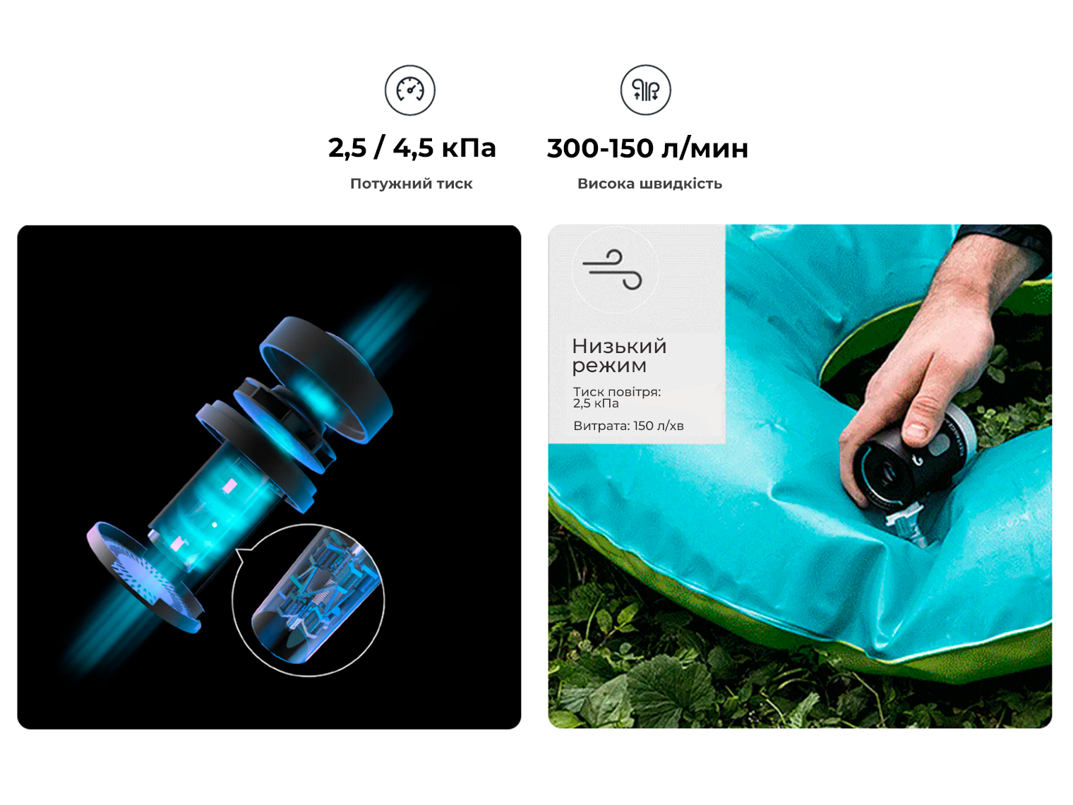 - Повітряний насос. Інноваційна технологія AirVortech™ дозволяє насосу нагнітати тиск до 4,5 кПа, досягаючи продуктивності від 150 л/хв до 300 л/хв залежно від вибраного режиму. Водночас пристрій демонструє високу автономність: насос працює до 60 хв без підзаряджання, надаючи достатньо потужності та часу для надування / здування всього необхідного.