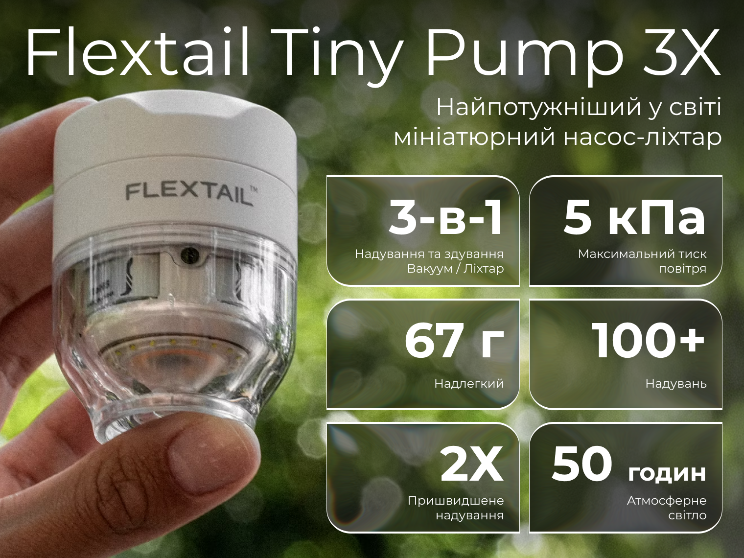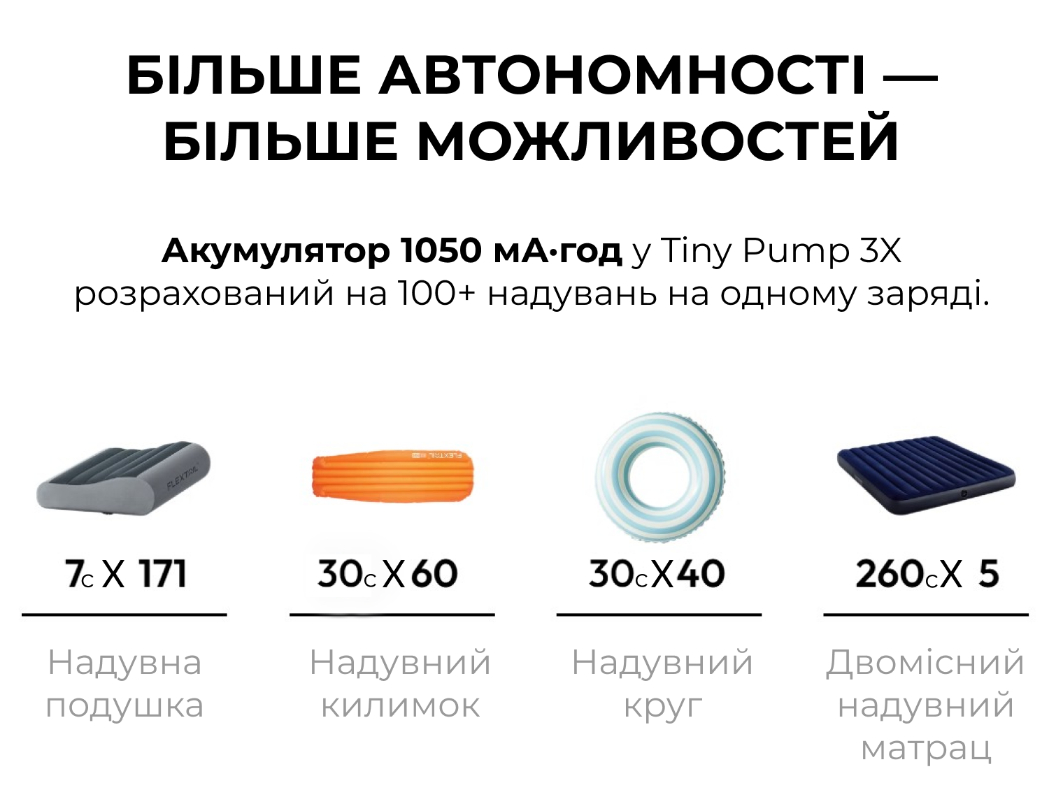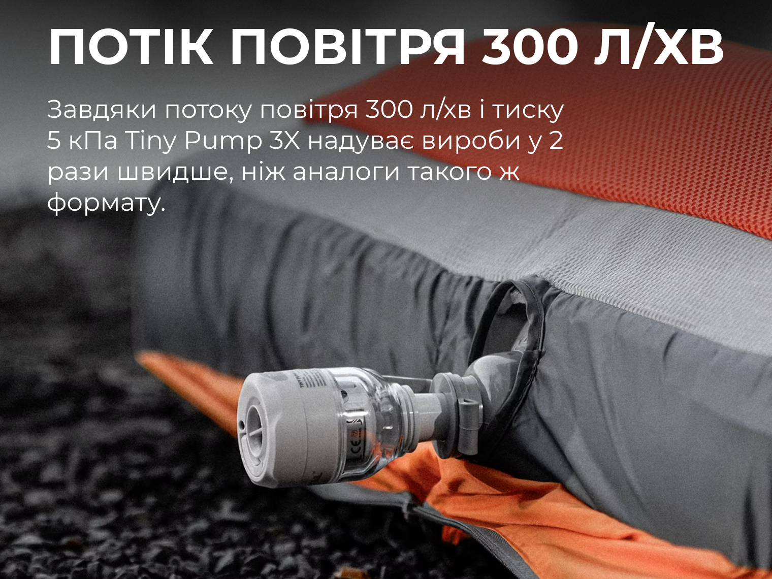 Повністю модернізований Вага Tiny Pump 3X становить лише 67 г. Модель на 41% менша за попередні версії, проте має вдвічі більшу потужність. Завдяки оновленій системі циркуляції повітря насос працює ефективно та тихо (65 дБ). Компактний корпус легко тримати однією рукою, носити в кишені або кріпити до рюкзака.