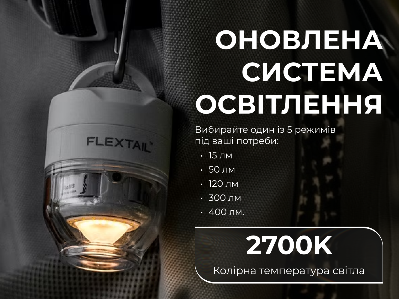 Вбудований ліхтар випромінює тепле м'яке світло з колірною температурою 2700K, що створює затишну атмосферу в наметі чи приміщенні. 5 режимів роботи задовольняють будь-які потреби — від нічного підсвічування до яскравого заливного світла: