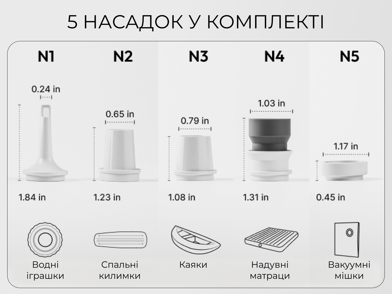 Насос Tiny Pump 3X, набір із 5 універсальних насадок (сумісні з 90% брендів спальних килимків), кабель для зарядки USB Type-C, інструкція користувача.