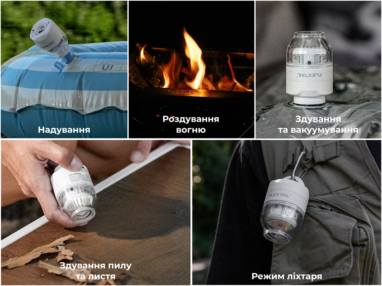 Потік повітря допомагає швидко розпалити вогонь у багатті або очистити об’єктив камери та клавіатуру від пилу.