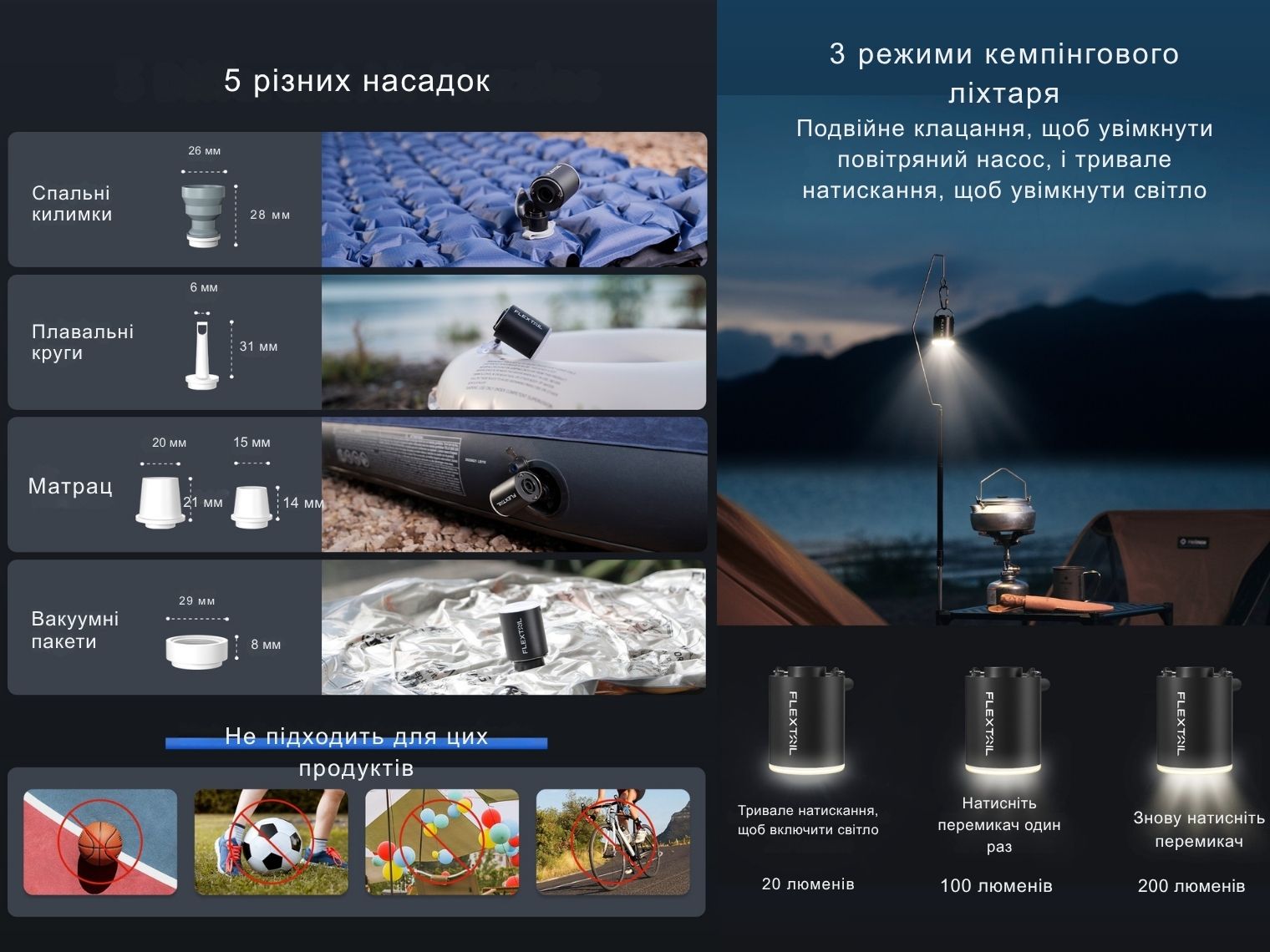 - міні-насос Flextail з функціями 3-в-1 (накачування, здування, кемпінгове світло);