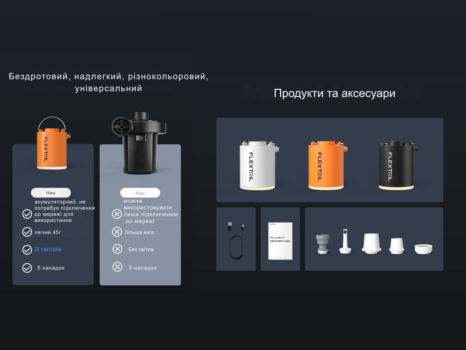 - міні-насос Flextail з функціями 3-в-1 (накачування, здування, кемпінгове світло);