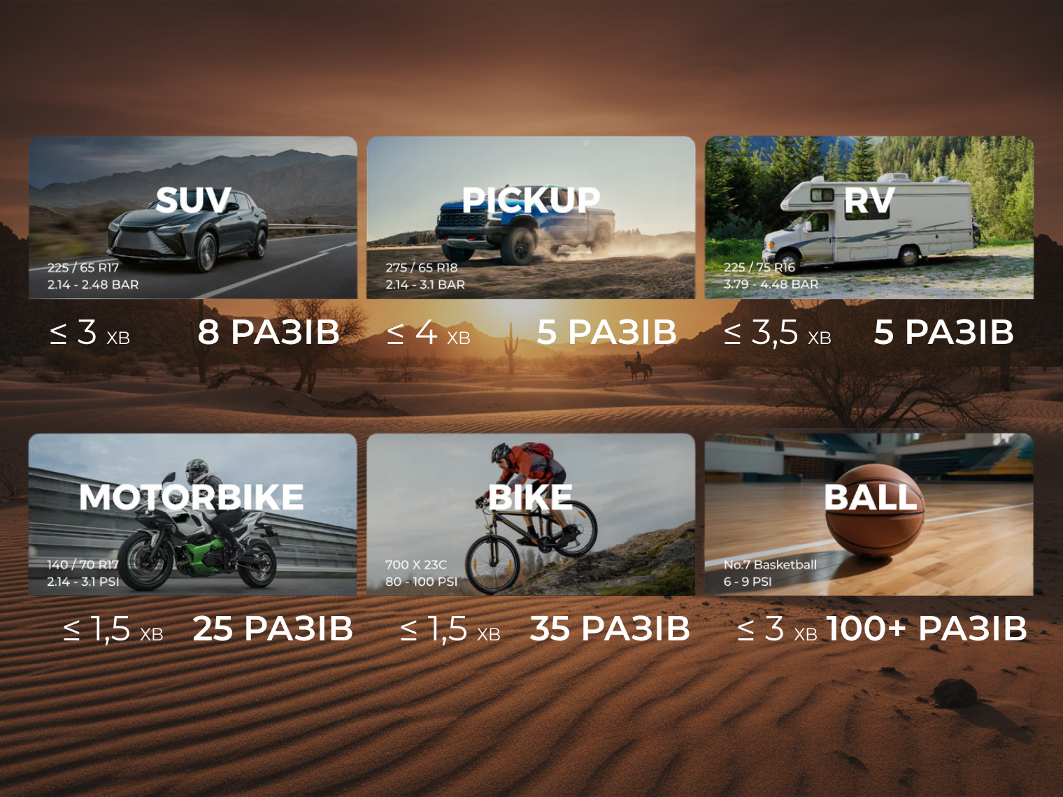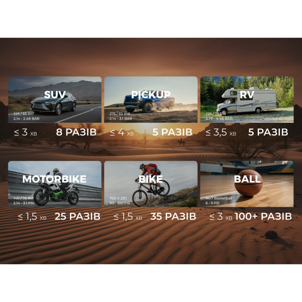 - час накачування (31–36 PSI) — < 2 хв;