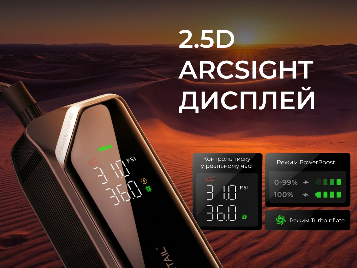 - Інтелектуальний насос. Створює тиск до 150 PSI (10.3 BAR) з точністю вимірювання ±1 PSI. Головною особливістю моделі є механічне поворотне кільце FlexiDial, яке дає змогу миттєво виставляти потрібні параметри. Передбачено 4 режими (авто, мото, вело, м'яч), а функція Auto Shut-off автоматично зупиняє компресор при досягненні заданого тиску. Показники відображаються на великому вигнутому дисплеї 2.5D ArcSight із захистом від подряпин та відбитків пальців.