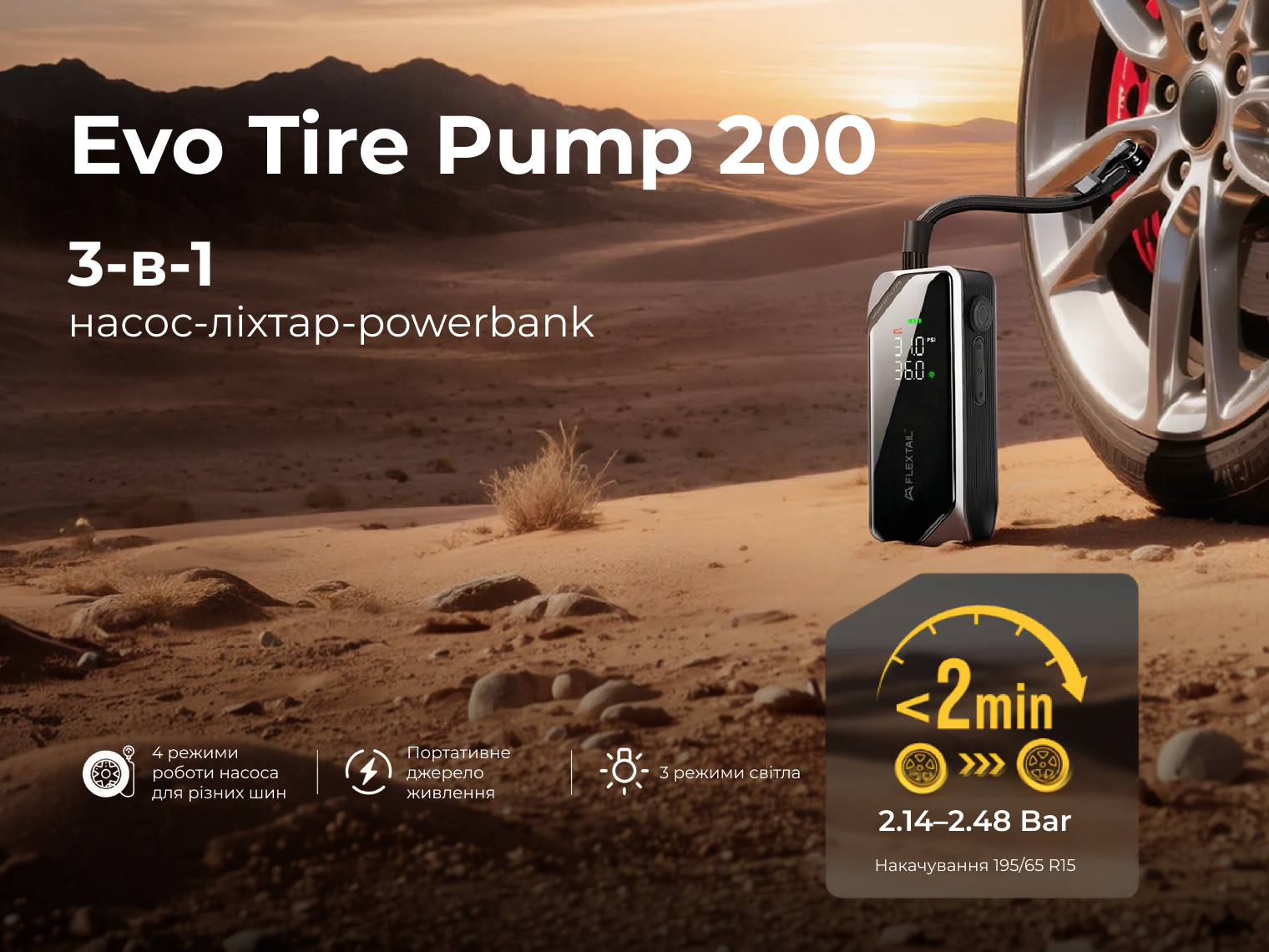 Опис насоса-ліхтаря-powerbank автомобільного Flextail Evo Tire Pump, 150 PSI, 2000 mAh: