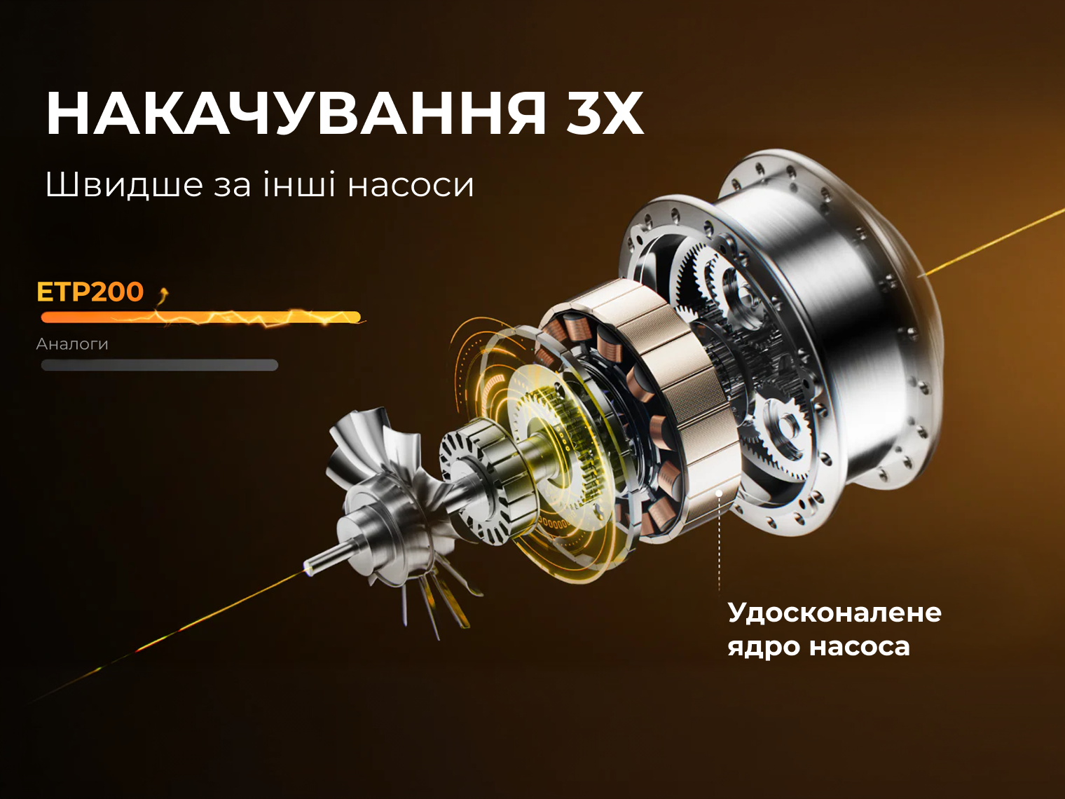 Пристрій базується на енергосистемі з трьох Li-ion елементів (22.2 Вт·год), що забезпечує до 28 хв безперервного накачування. Завдяки вдосконаленому внутрішньому механізму швидкість подачі повітря у 3 рази вища, ніж у стандартних портативних насосів, що дає змогу підкачати автомобільну шину менш ніж за 2 хв.