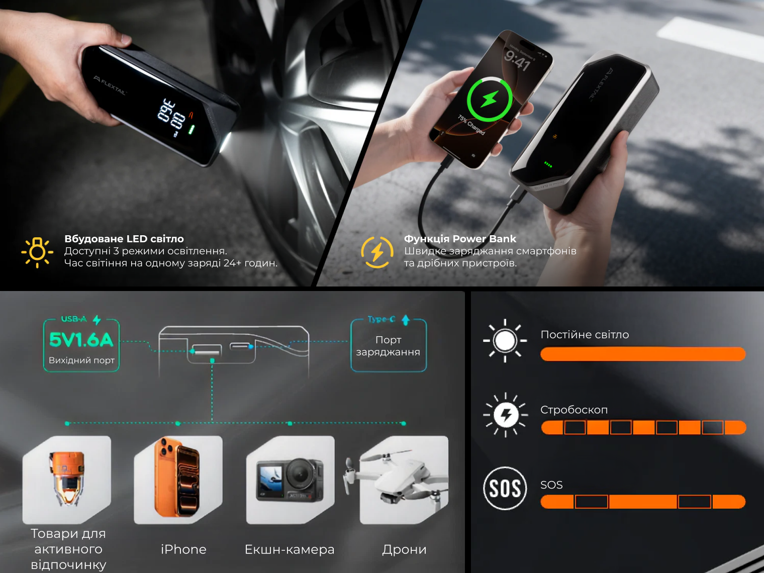 - вихідний порт (Powerbank) — USB-A (5V / 1.6A);