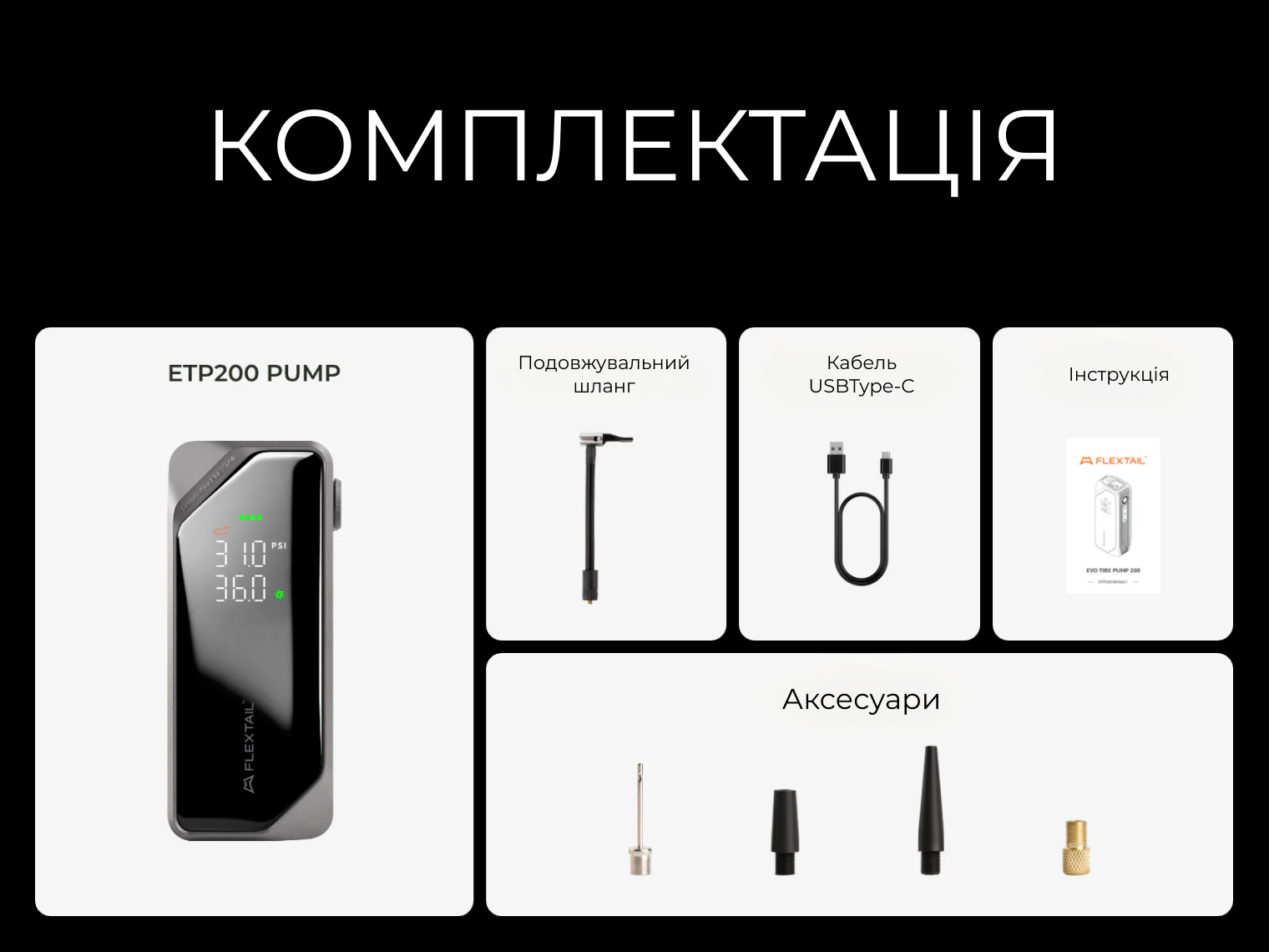 Насос ETP200, подовжувальний повітряний шланг, набір універсальних насадок-перехідників, кабель USB Type-C, інструкція користувача.
