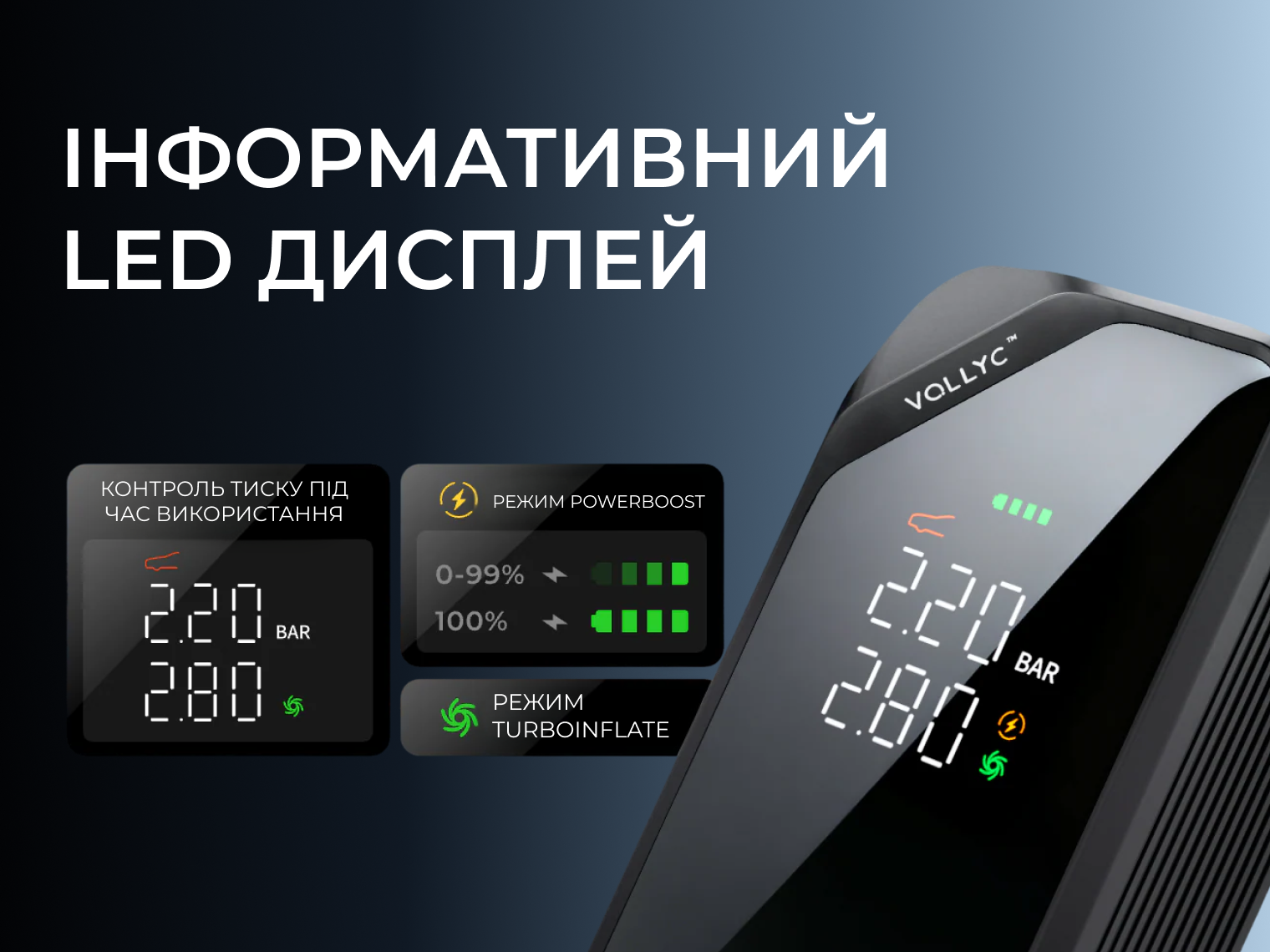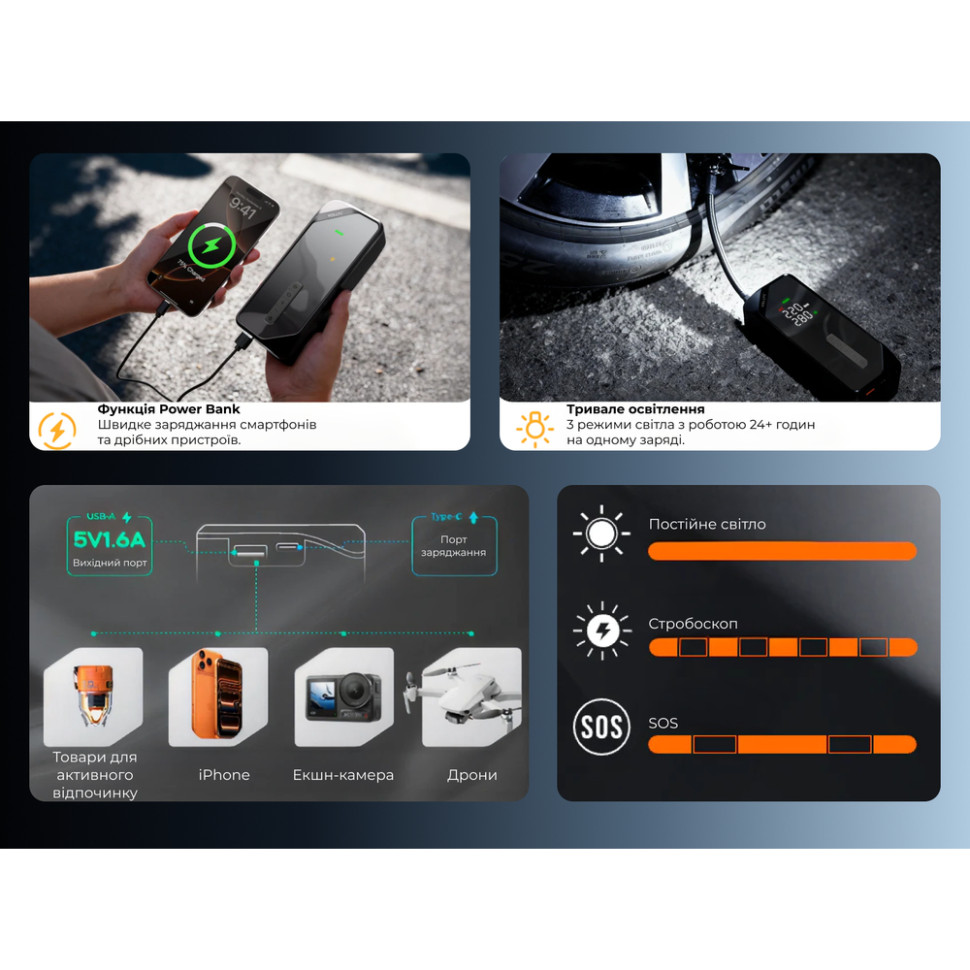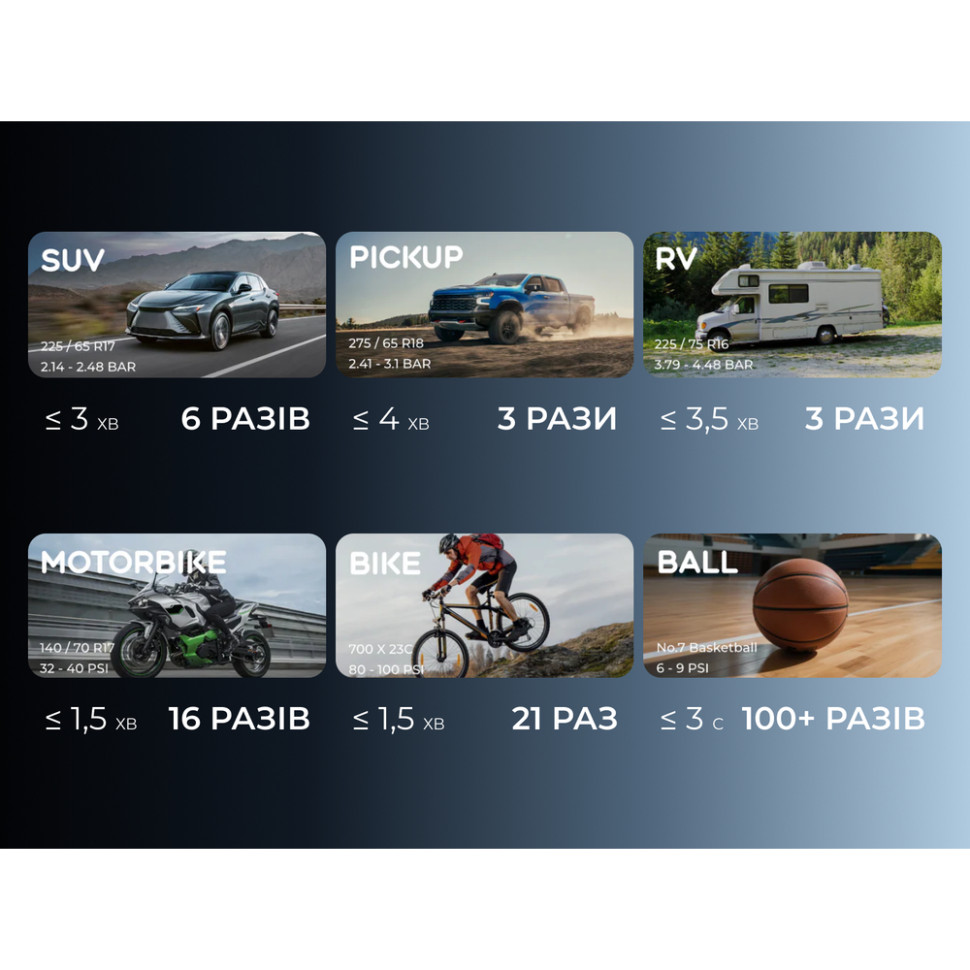 - Інтелектуальний насос. Швидко накачує шину (з 2.14 до 2.48 бар) менш ніж за 2 хвилини. Автоматичні режими для авто, мотоцикла, велосипеда та м'яча самі підбирають оптимальний тиск.