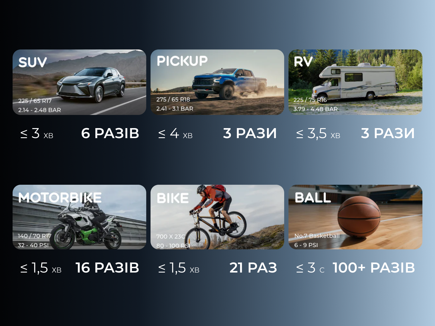- час накачування (31–36 PSI) — < 2 хв;