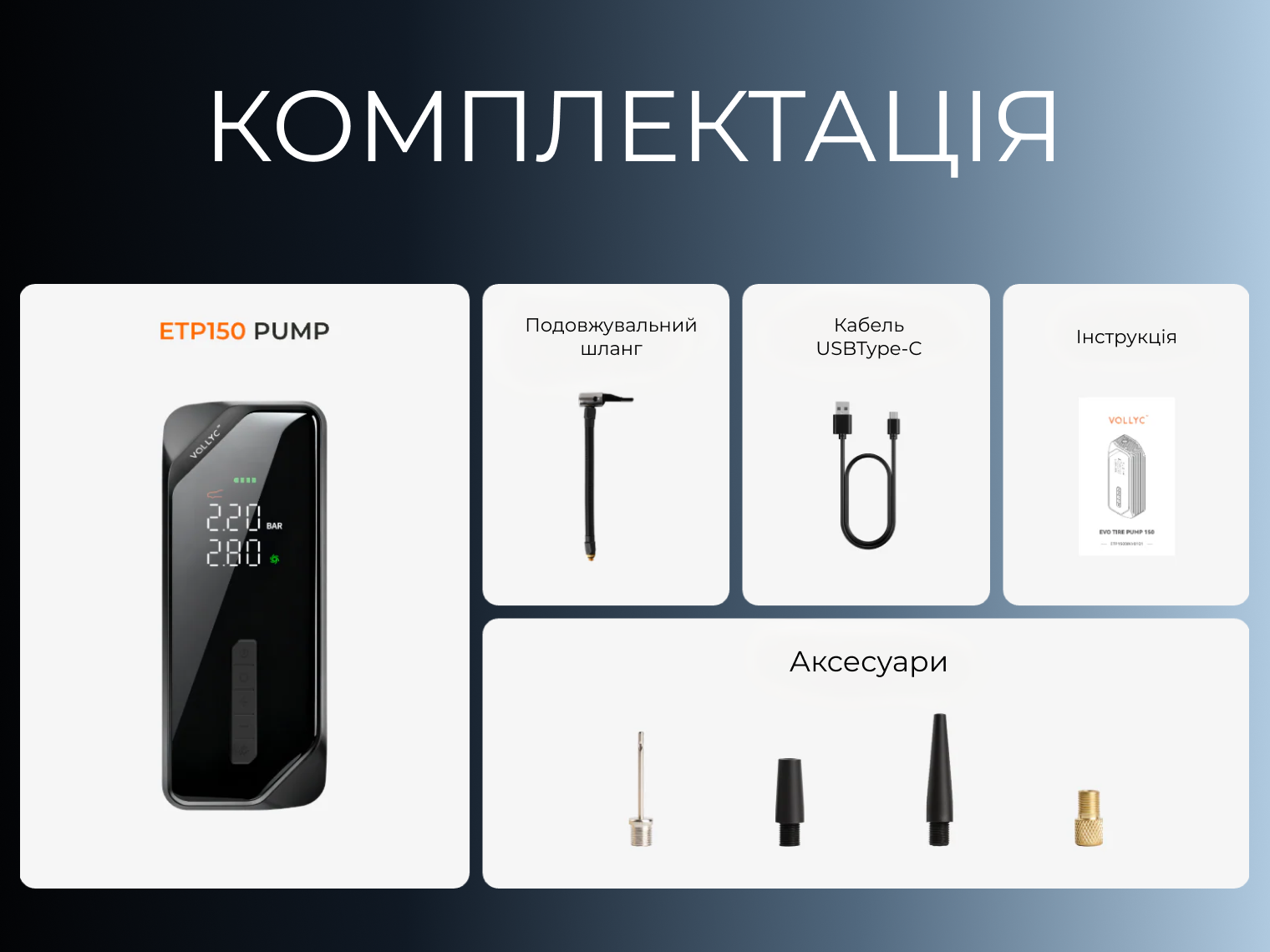 Насос Evo Tire Pump, подовжувальний повітряний шланг з герметичним конектором, набір універсальних насадок (голка для м'ячів, перехідники для клапанів Presta/Schrader), кабель для зарядки USB Type-C, інструкція користувача.