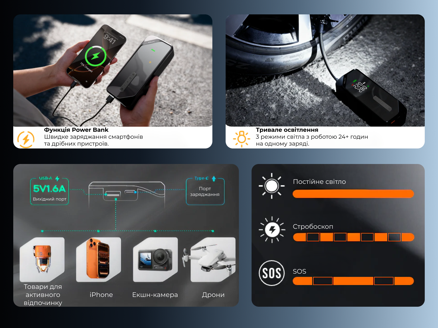 - Powerbank. Через вихідний порт USB можна заряджати смартфони, дрони або іншу електроніку. Це стабільне джерело енергії, яке допоможе залишитися на зв'язку в будь-якому місці.