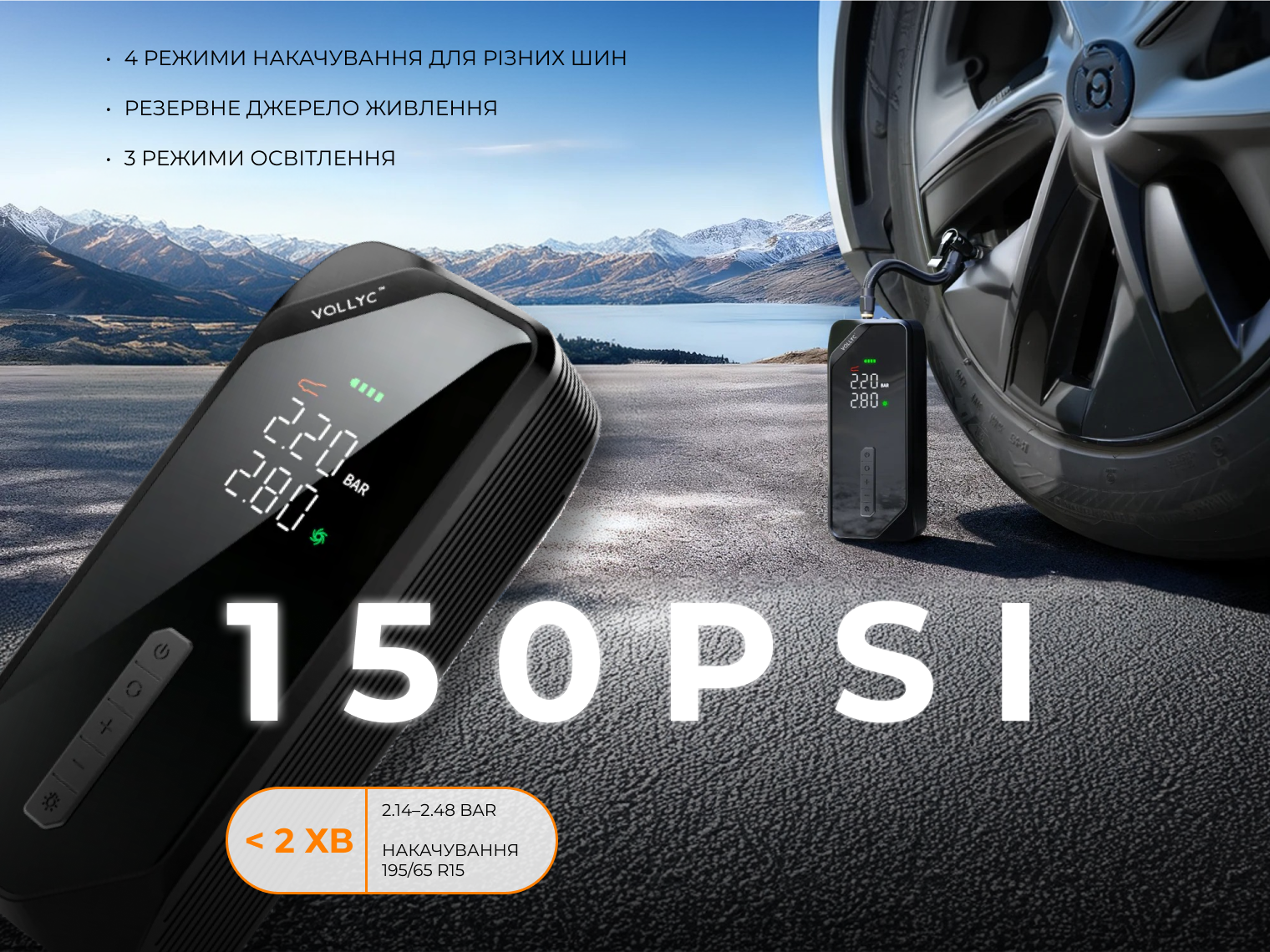 Опис насоса-ліхтаря-powerbank автомобільного Vollyc Evo Tire Pump by Flextail, 150 PSI, 1500 mAh: