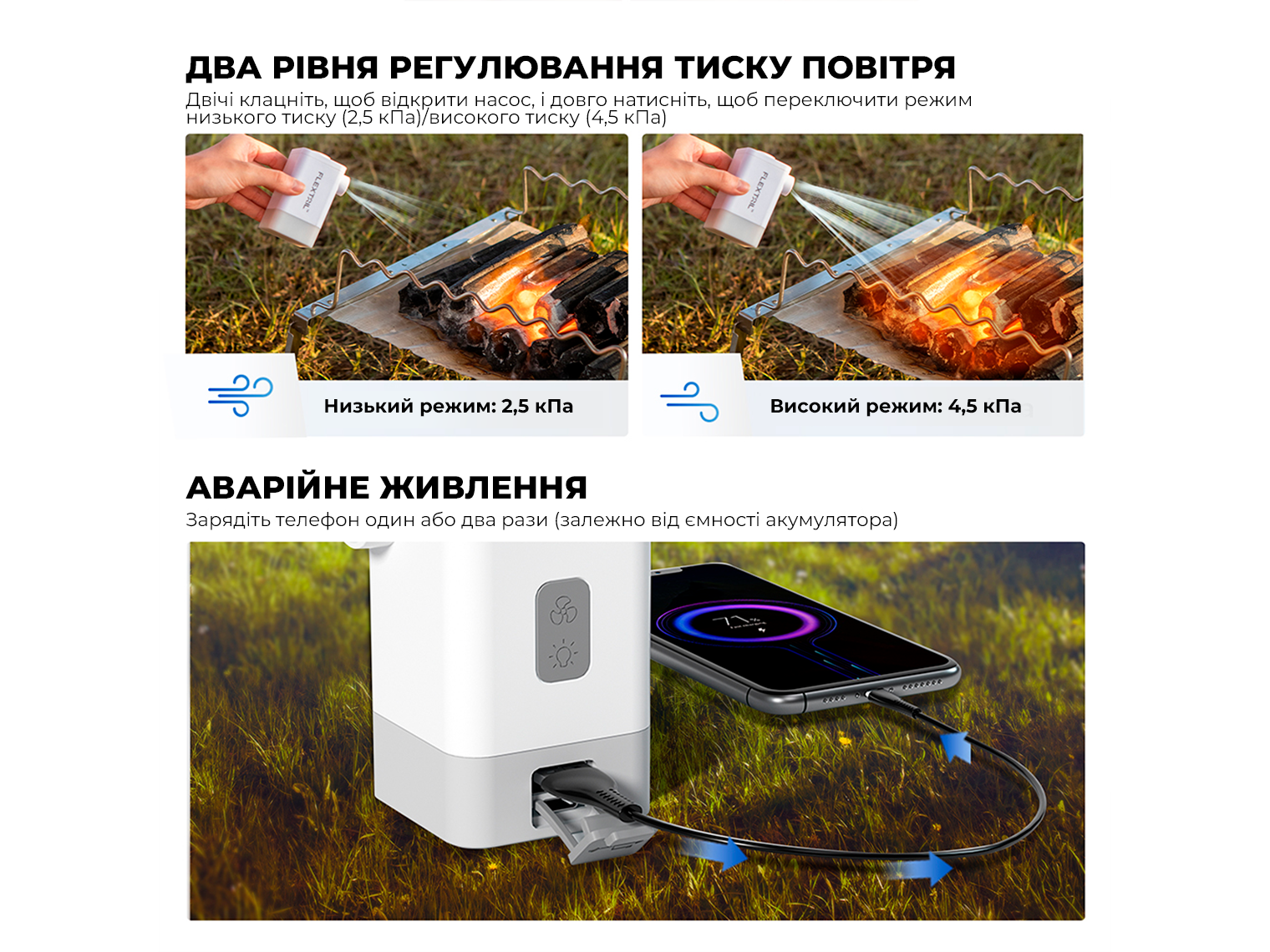 Пристрій Flextail Max Pump 2 Plus — це модель 4 в 1! З її допомогою ви швидко надуєте та здуєте матраци, килимки та інші надувні вироби, роздмухаєте багаття та освітите місце для відпочинку. Але це ще не все! Прилад також здатен заряджати дрібні гаджети, підтримуючи рівень заряду необхідної техніки для комфортної подорожі!