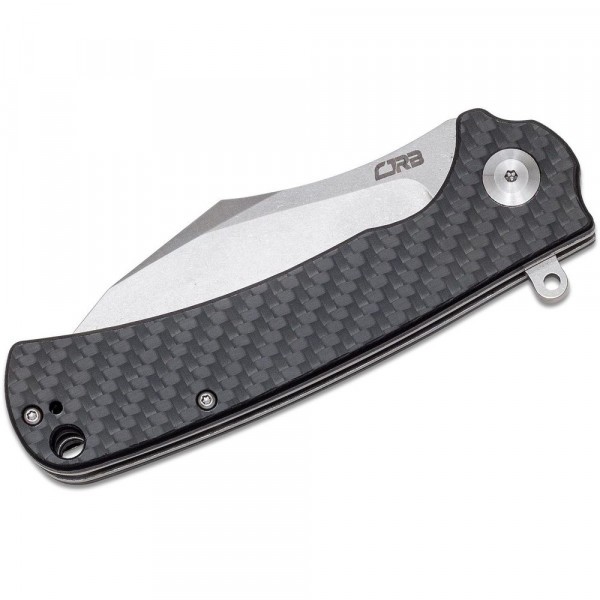 Клинок плавно переходить в ергономічну ручку. Накладки виготовлені з вуглецевого волокна, що забезпечує впевнене утримання ножа навіть мокрими руками.
