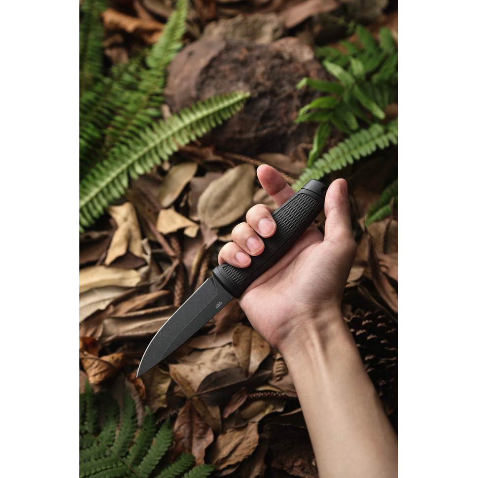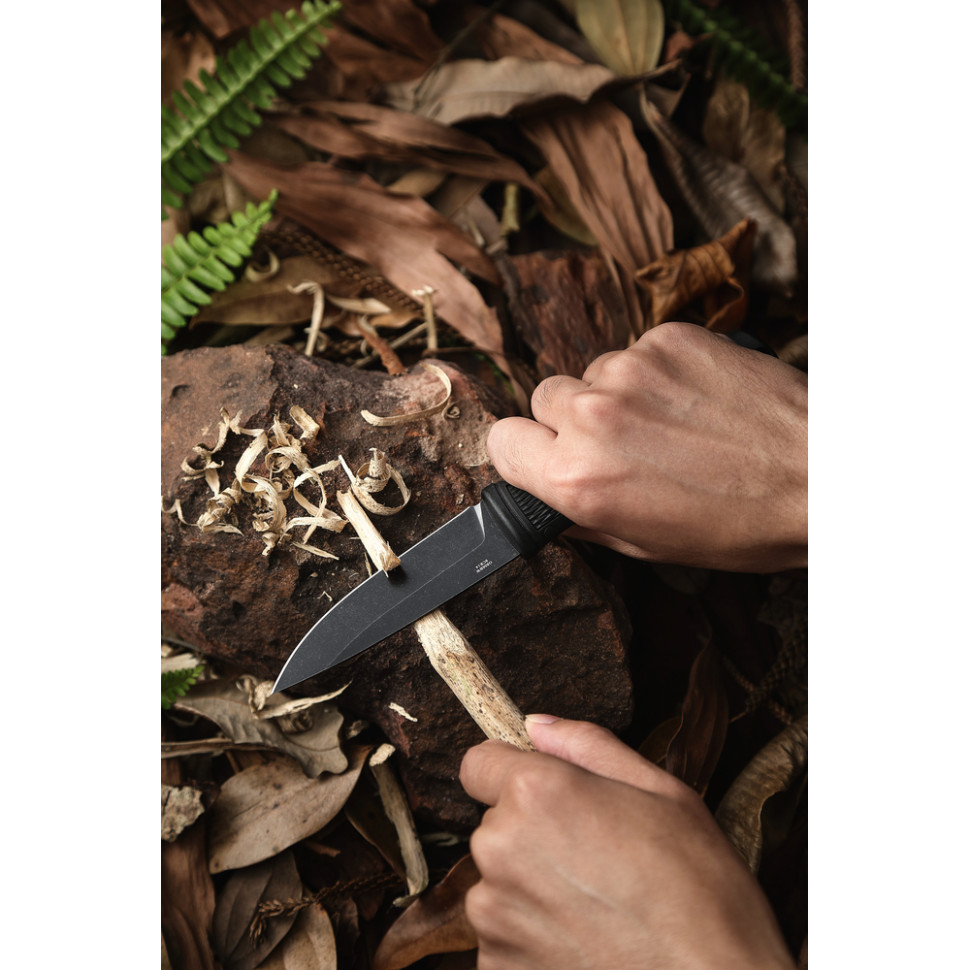 Класичний профіль Drop Point з прямим заточуванням забезпечує контрольоване різання. Кінчик трохи звужений, що дозволяє працювати на проколювання без шкоди для міцності.