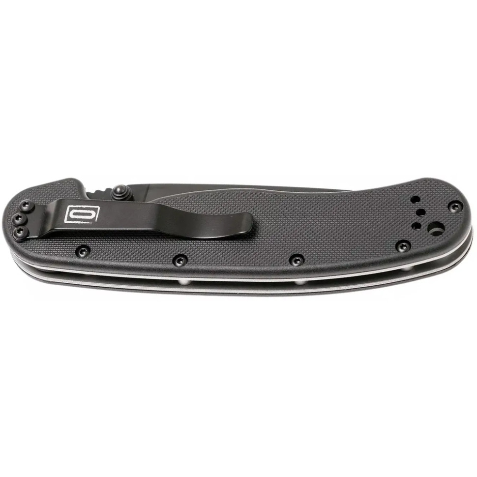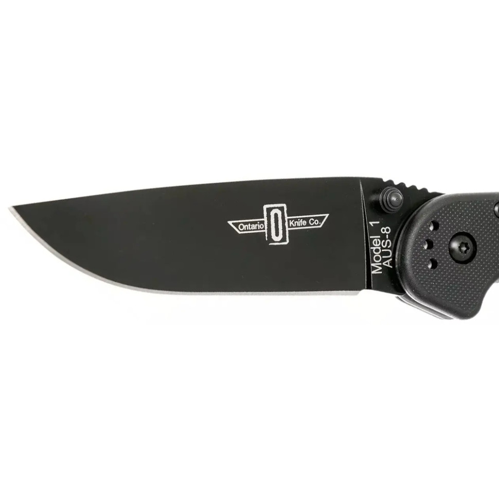 Клинок профілю Drop Point виготовлений з інструментальної сталі D2 або класичної для OKC AUS-8. Клинок приводиться в робоче положення за допомогою двостороннього шпеника, а фіксується надійним замком Liner Lock. Насічки на обуху забезпечують додатковий упор та контроль клинка при роботі.