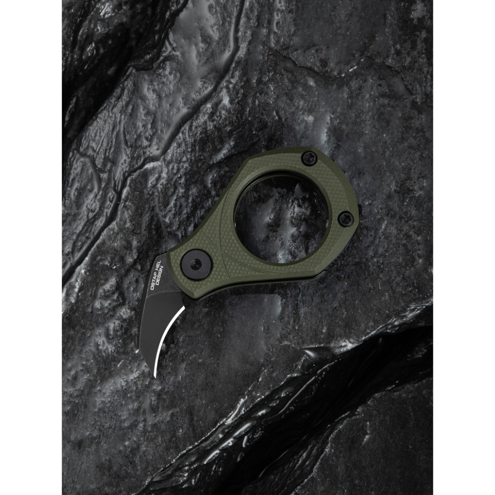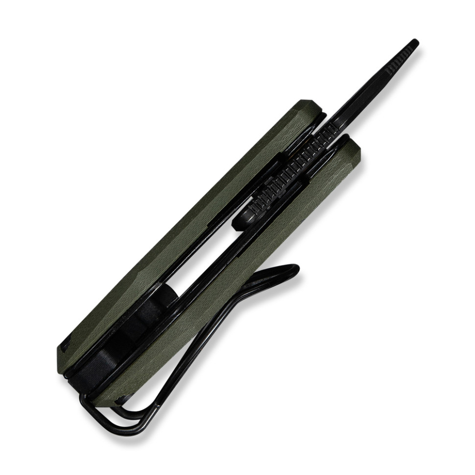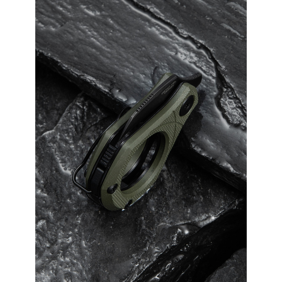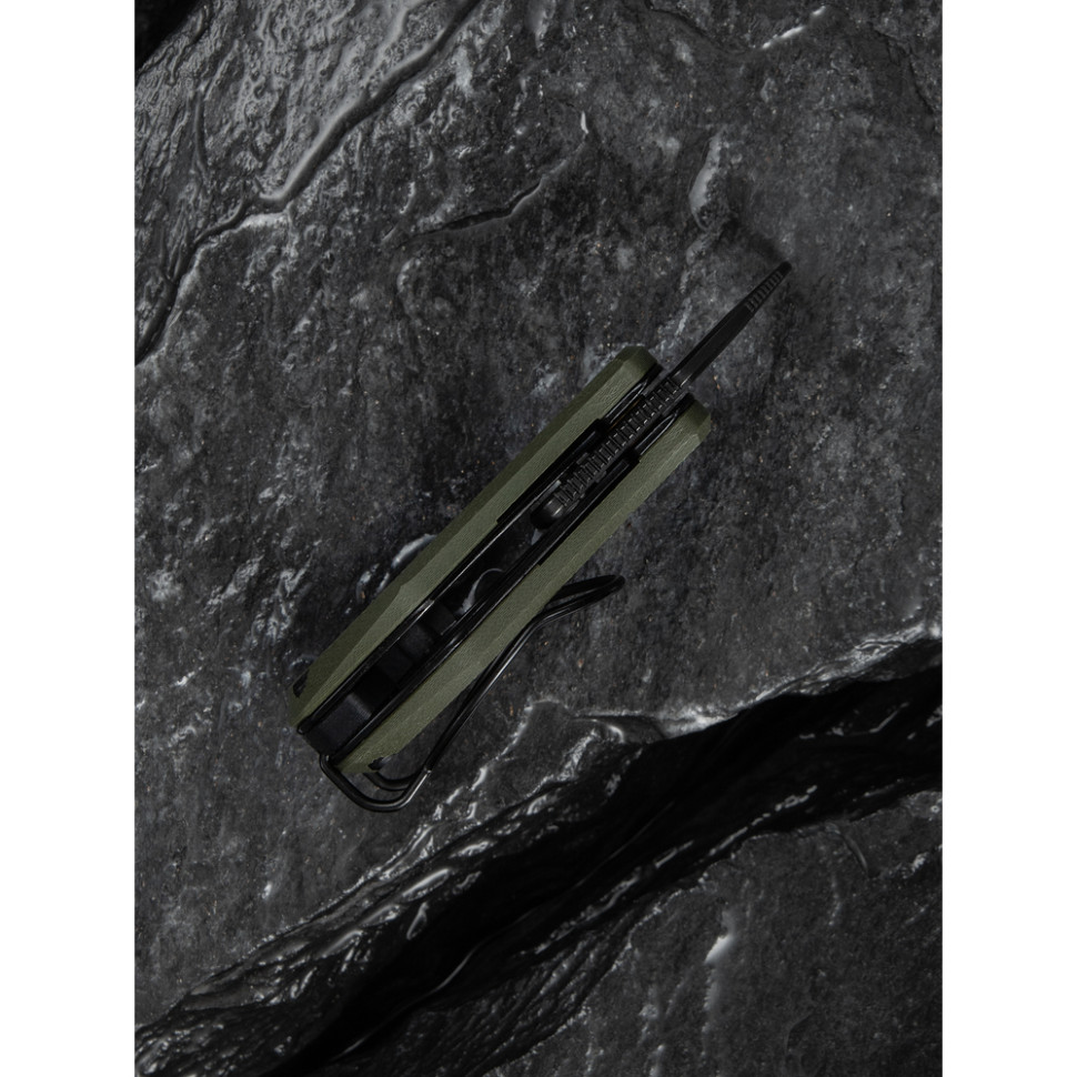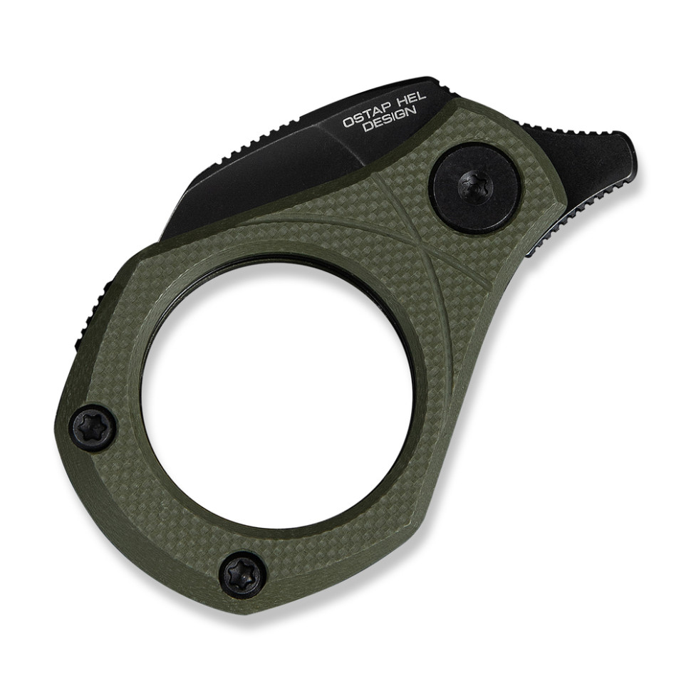 - Руків’я з композиту G10. Накладки оливкового кольору мають чітку текстуру, що дозволяє впевнено тримати ніж двома чи трьома пальцями. Матеріал стійкий до ударів та не вбирає запахи.