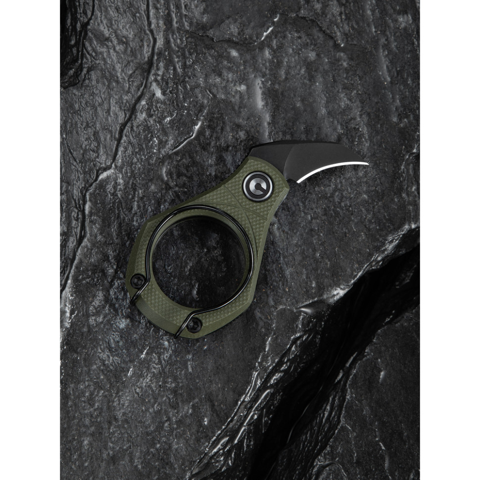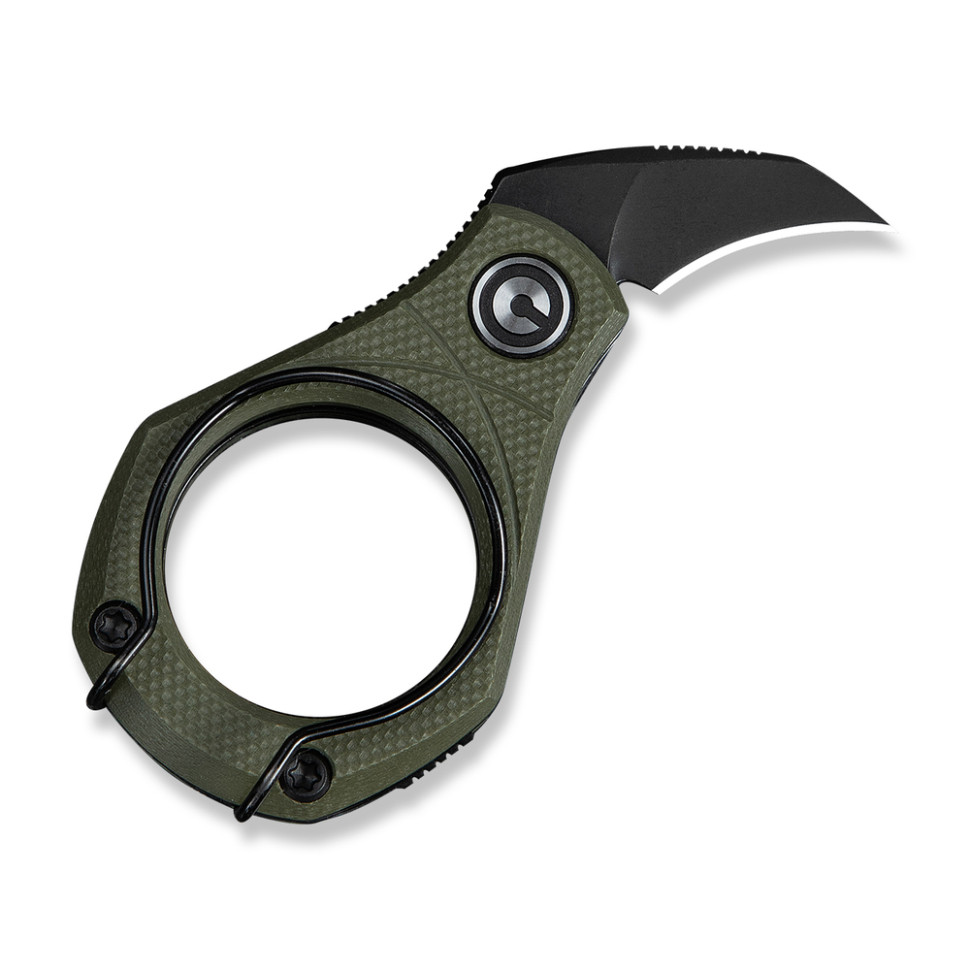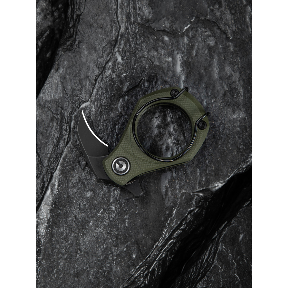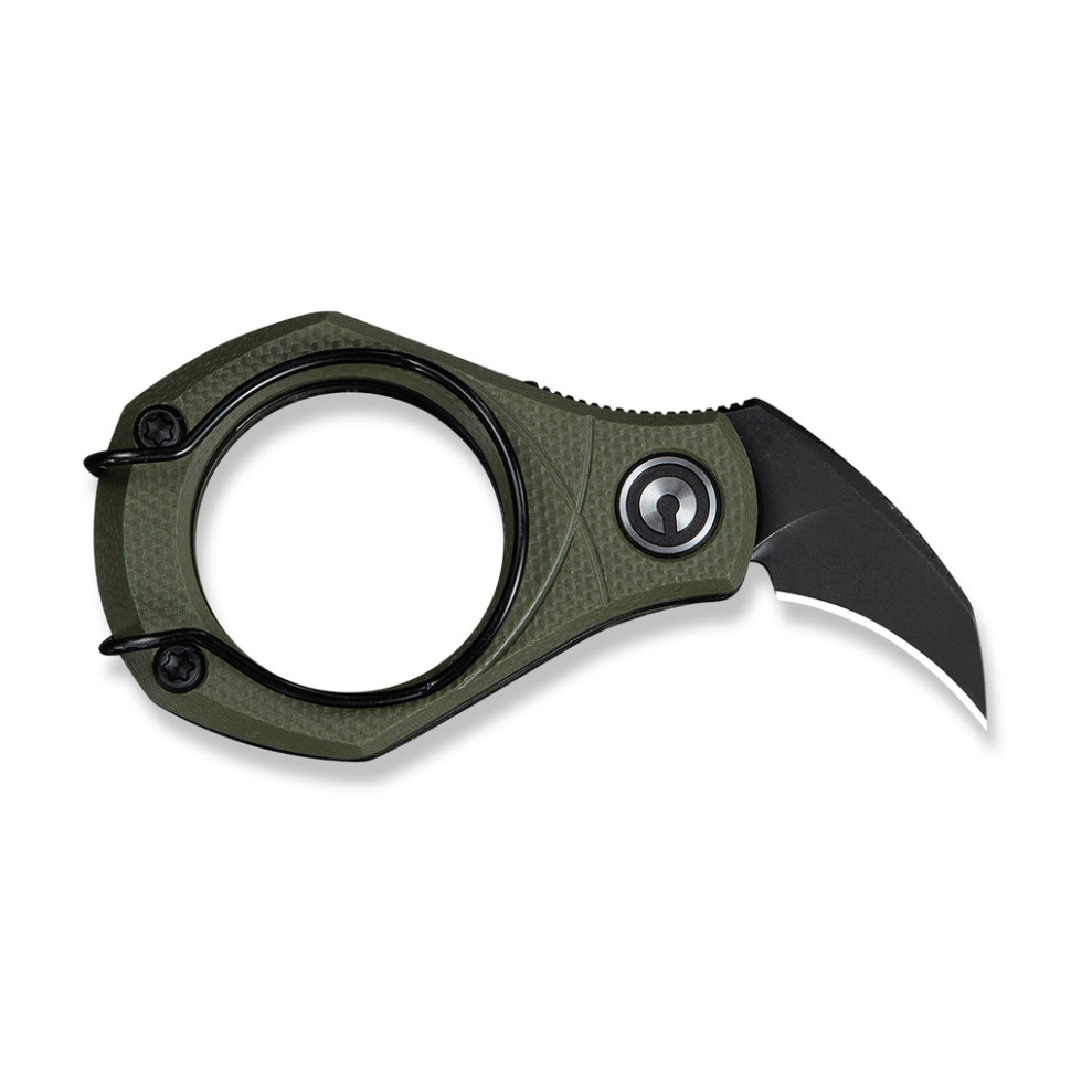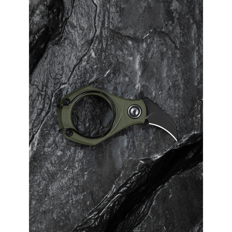 - Руків’я з композиту G10. Накладки оливкового кольору мають чітку текстуру, що дозволяє впевнено тримати ніж двома чи трьома пальцями. Матеріал стійкий до ударів та не вбирає запахи.