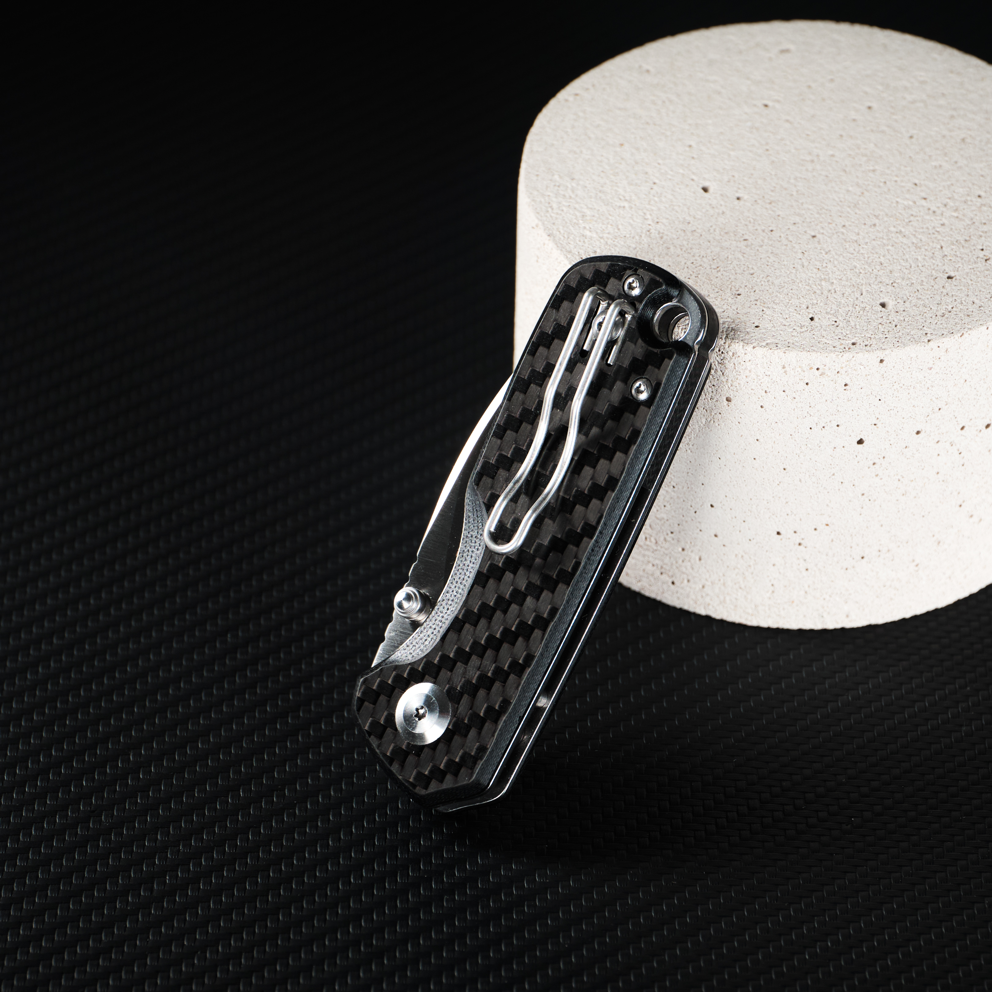 Матеріал руківʼя — склопластик G10, що часто застосовується у виробництві EDC ножів через його ударостійкість та несприйнятливість до температурних перепадів. Карбонове напилення прикрашає дизайн і слугує додатковим шаром, що зміцнює руківʼя на випадок механічного впливу. Отвір у хвості призначений для фіксації паракорду.