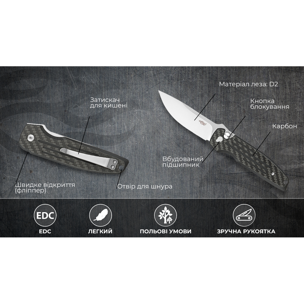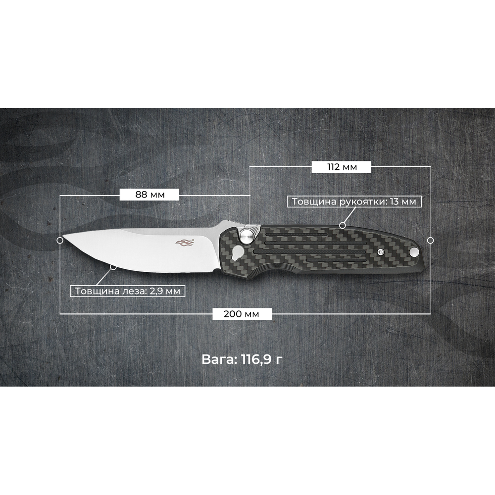 З урахуванням ваги, що дорівнює 116 г, ніж Firebird FH926 зберігає головну перевагу складаних інструментів — зручність у транспортуванні. Ви можете носити модель у місті, брати її на риболовлю, полювання чи в подорож. Достатньо закріпити конструкцію на кишені за допомогою тугої кліпси.