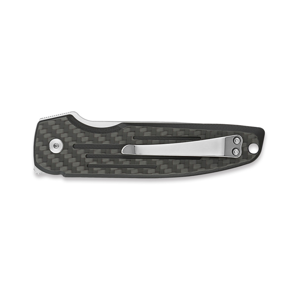 - Карбонові накладки на руківʼї. Карбон характеризується високою стійкістю до механічних пошкоджень. Це означає, що руківʼя не боїться подряпин та ударів під час активної експлуатації ножа. До того ж матеріал несприйнятливий до впливу вологи та має унікальний зовнішній вигляд, який припаде до душі поціновувачам естетики.