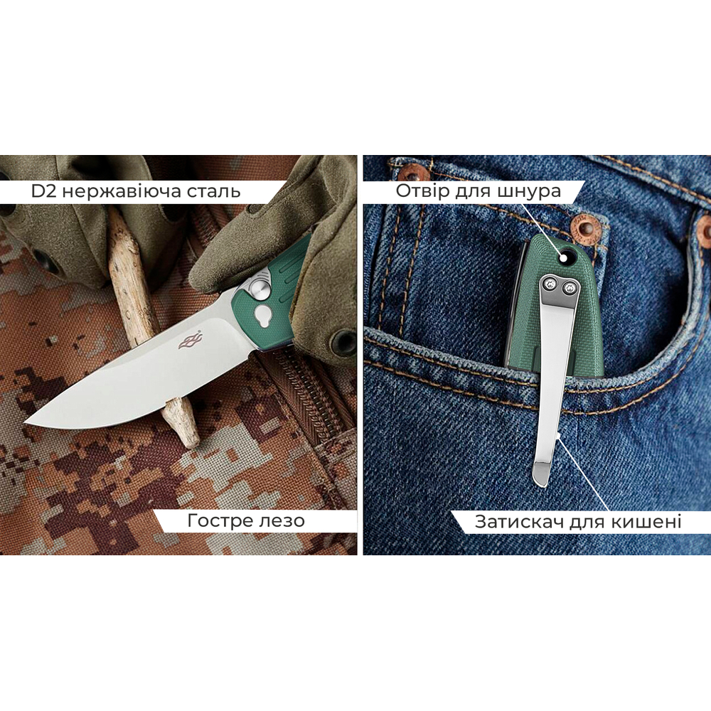 З урахуванням ваги, що дорівнює 116 г, ніж Firebird FH926 зберігає головну перевагу складаних інструментів — зручність у транспортуванні. Ви можете носити модель у місті, брати її на риболовлю, полювання чи в подорож. Достатньо закріпити конструкцію на кишені за допомогою тугої кліпси.