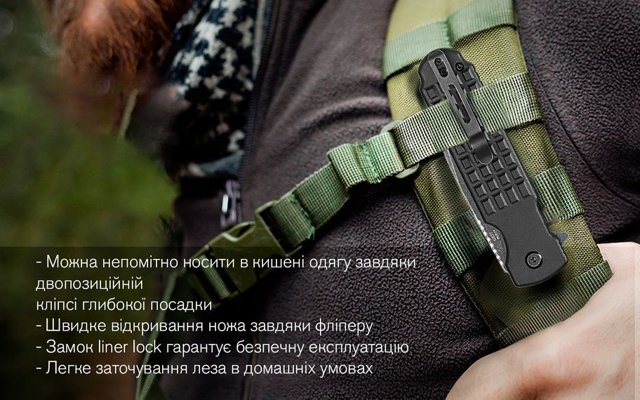 Довжина складеного ножа не перевищує 115 мм. Він важить 130 г з урахуванням кліпси.