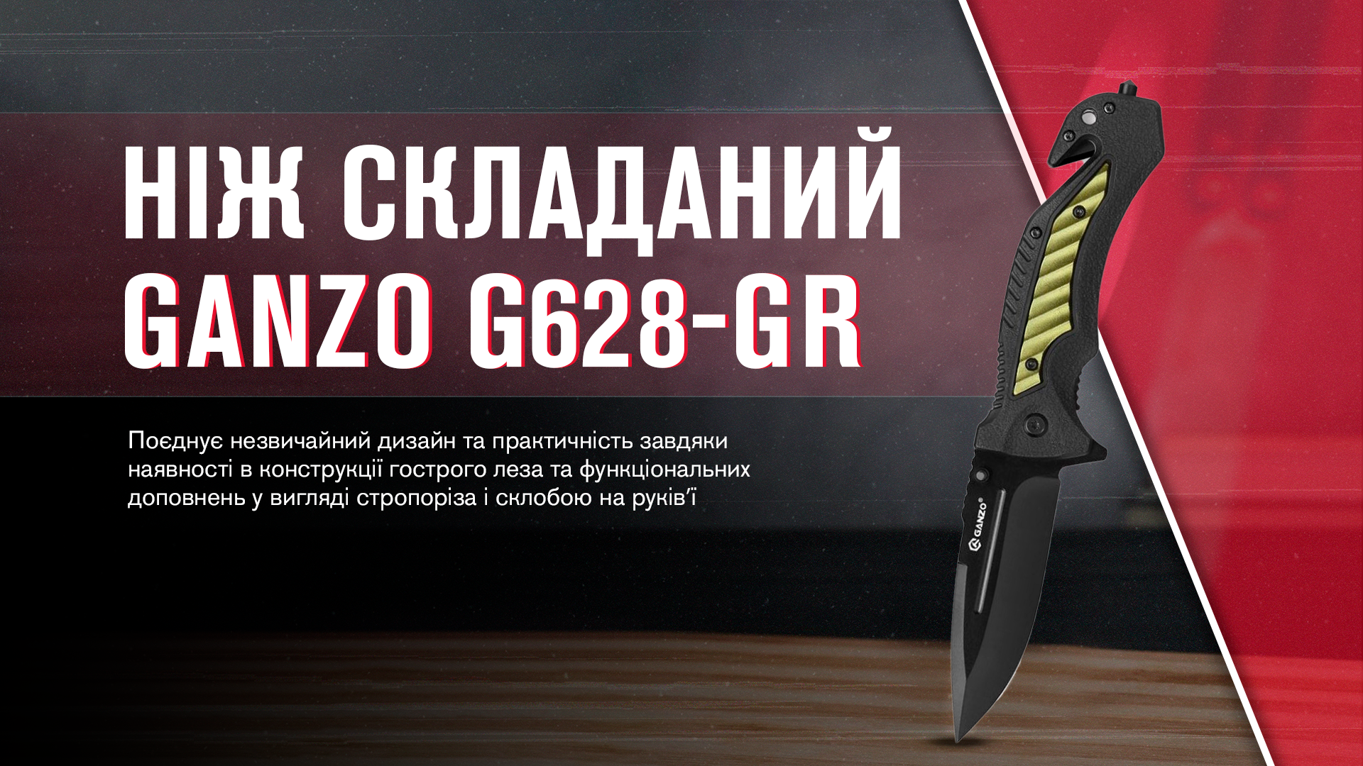 Незвичайний дизайн — це перше, що привертає увагу при погляді на ніж Ganzo G628. Складаний клинок має чорне покриття в тон руківʼю, що додає деяку брутальність в загальний вигляд інструмента. Водночас модель не позбавлена практичності завдяки наявності в конструкції гострого леза та кількох функціональних доповнень у вигляді стропоріза й склобою на руківʼї, які роблять з ножа ідеального супутника для туристичних подорожей.