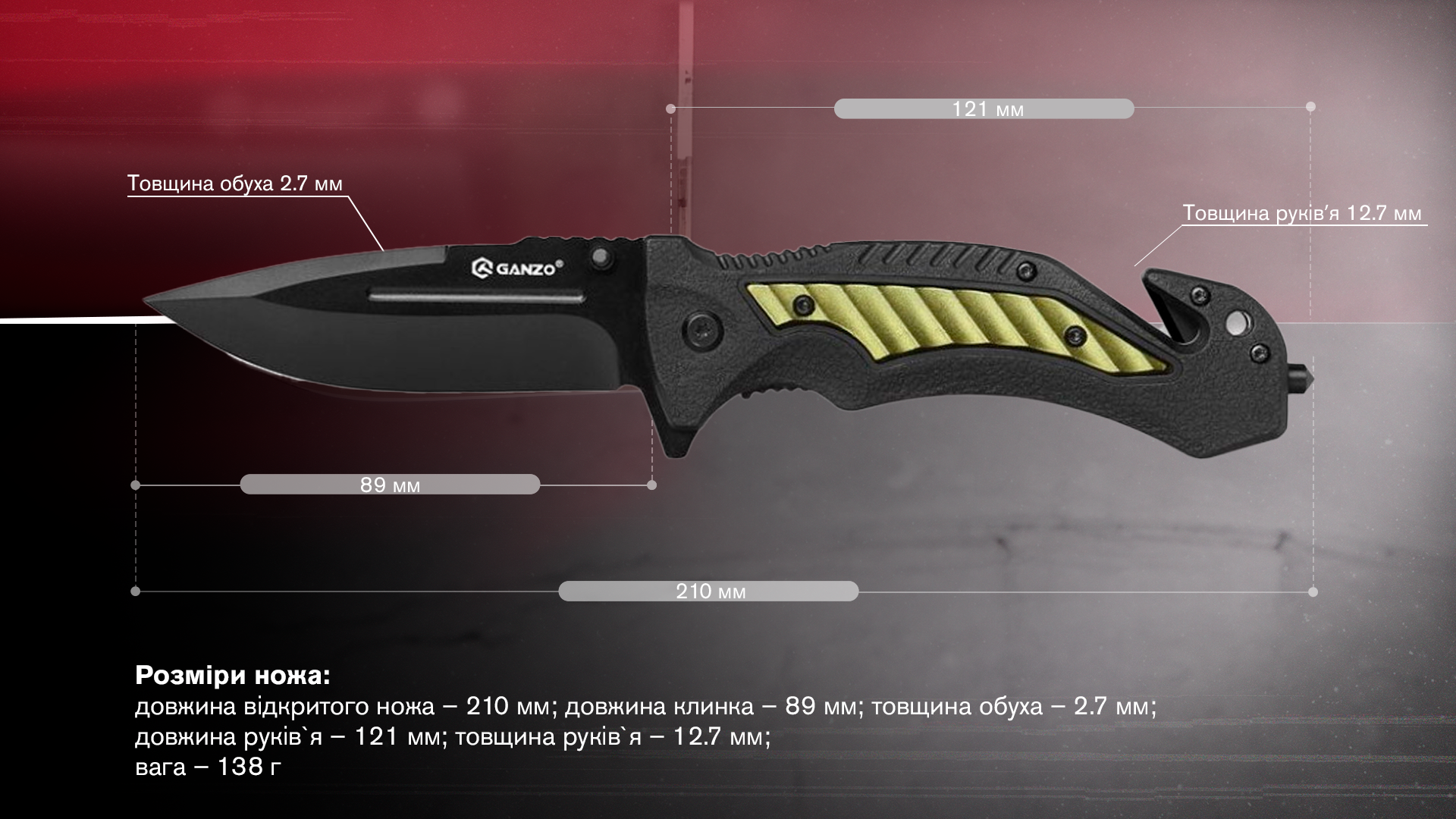 - довжина відкритого ножа – 210 мм;