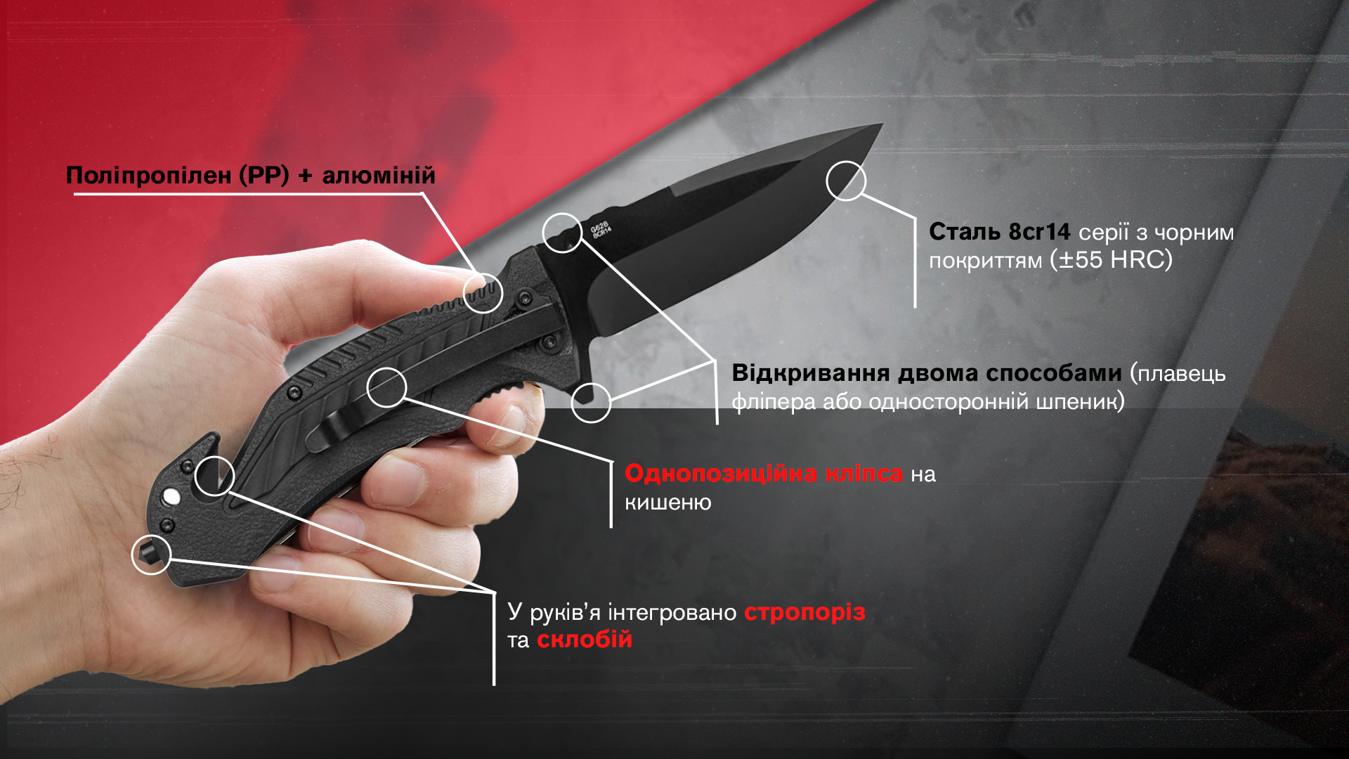 - матеріал клинка – сталь 8cr14 твердістю ±58 HRC;