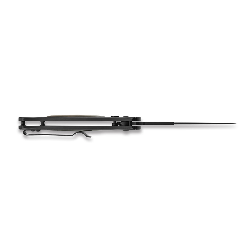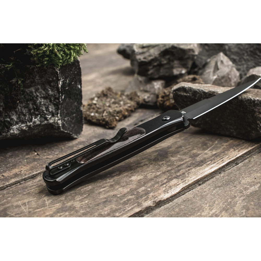 Клинок і руківʼя мають чорне покриття, яке не тільки прикрашає дизайн, але також матує відбитки пальців та зміцнює метал. Кліпса, закріплена на руківʼї за допомогою двох гвинтів, забезпечує надійне кріплення інструмента до пояса чи кишені одягу.