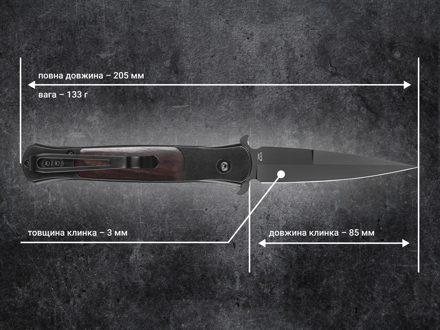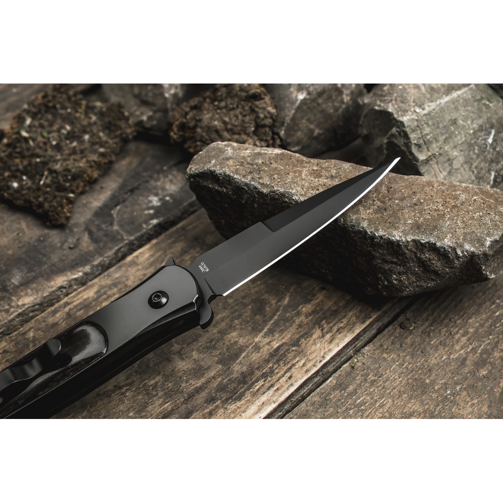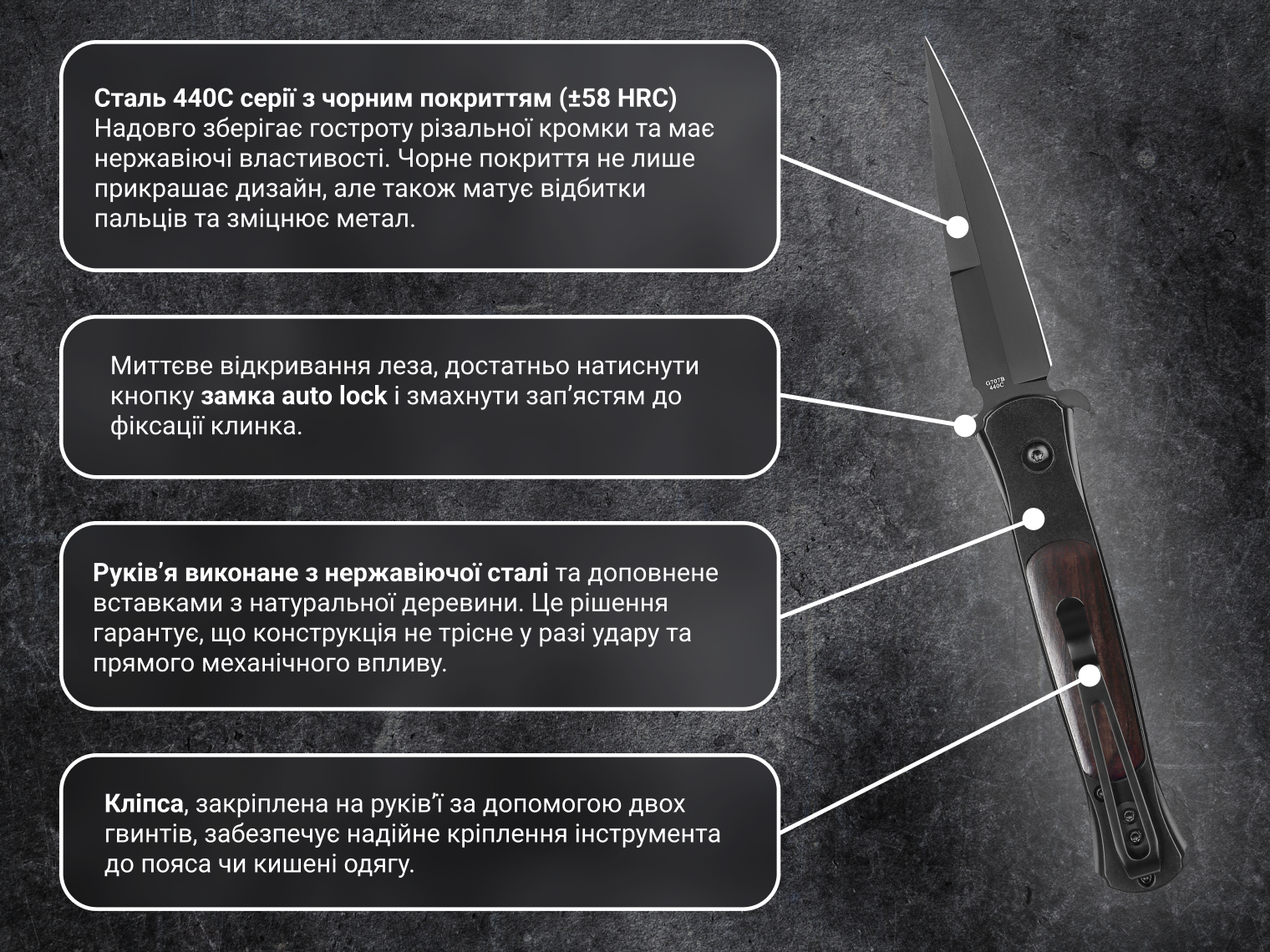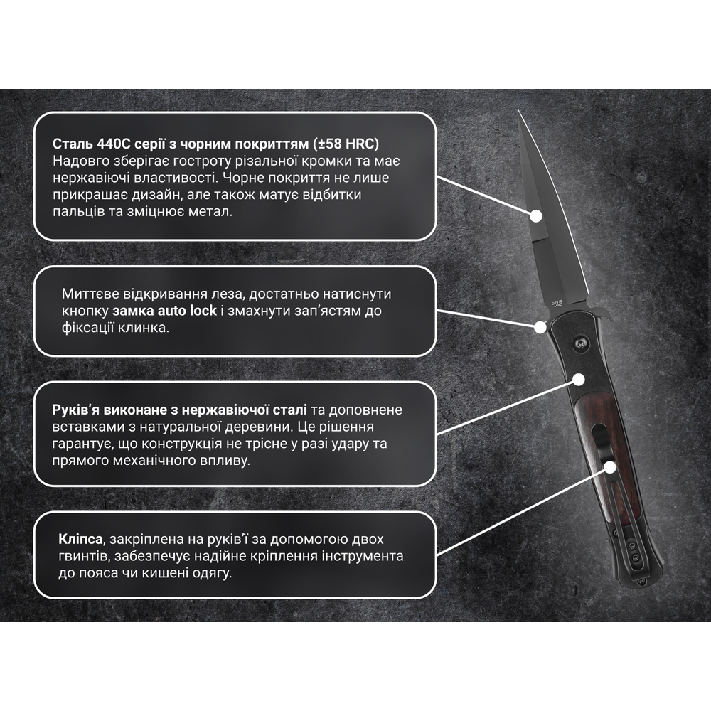 - клинок із нержавіючої сталі 440С, загартованої до ±58 HRC;