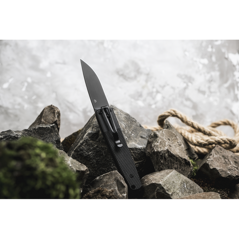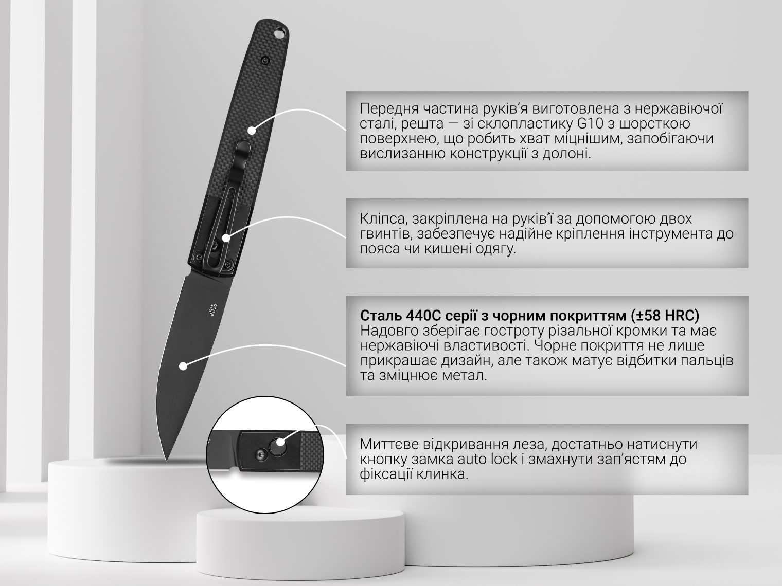 - Сталь 440С в клинку має нержавіючі властивості та надовго зберігає гостроту після заточування, тому не вимагає спеціального догляду. До того ж метал загартований до твердості ±58 HRC, що в сукупності з чорним зміцнювальним покриттям підвищує ефективність роботи зі щільними матеріалами, як пластик або деревина.