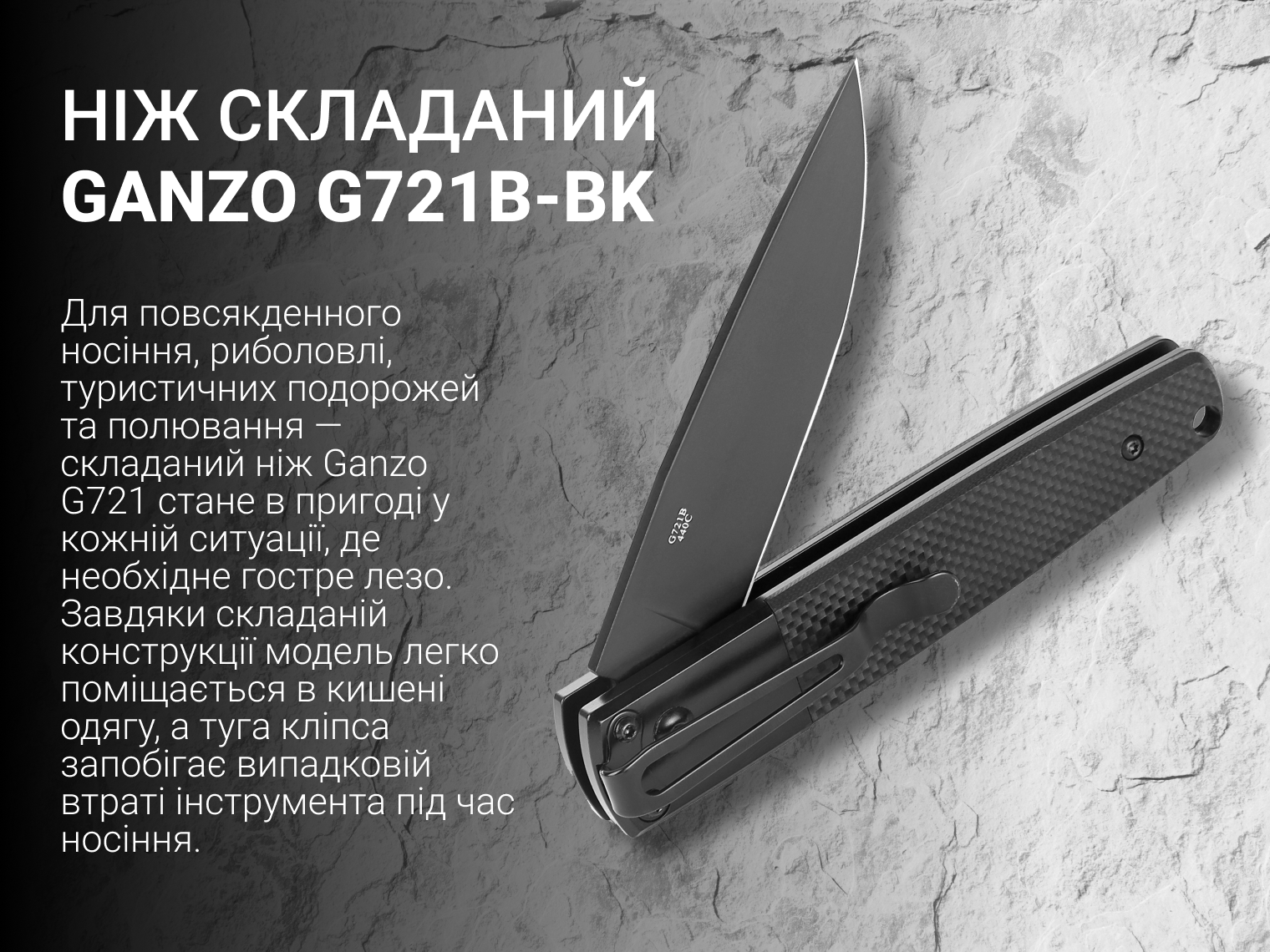 Для повсякденного носіння, риболовлі, туристичних подорожей та полювання — складаний ніж Ganzo G721 стане в пригоді в кожній ситуації, де необхідне гостре лезо. Завдяки складаній конструкції модель легко поміщається в кишені одягу, а туга кліпса запобігає випадковій втраті інструмента під час носіння.