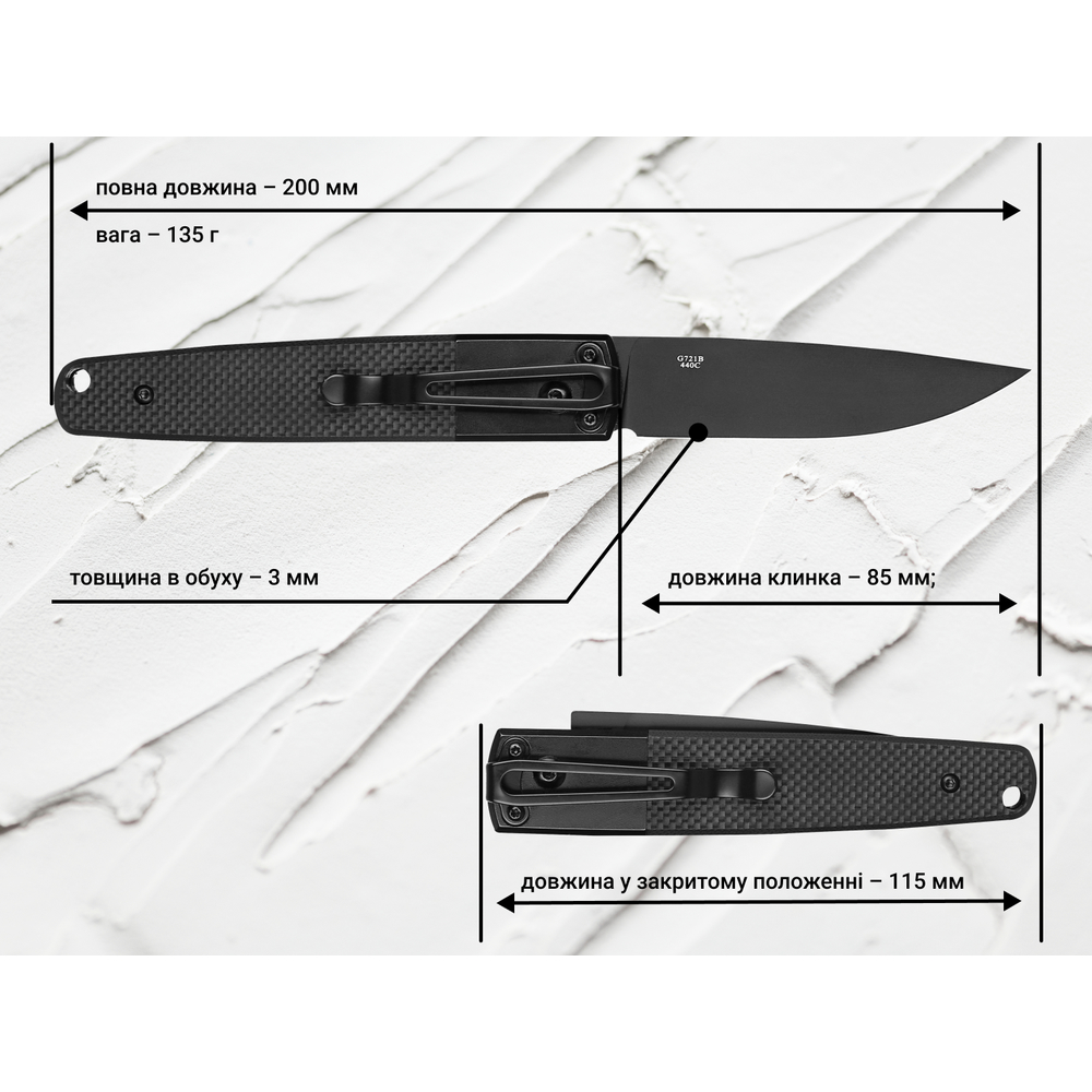 - клинок із нержавіючої марки сталі 440С (твердість ±58 HRC);