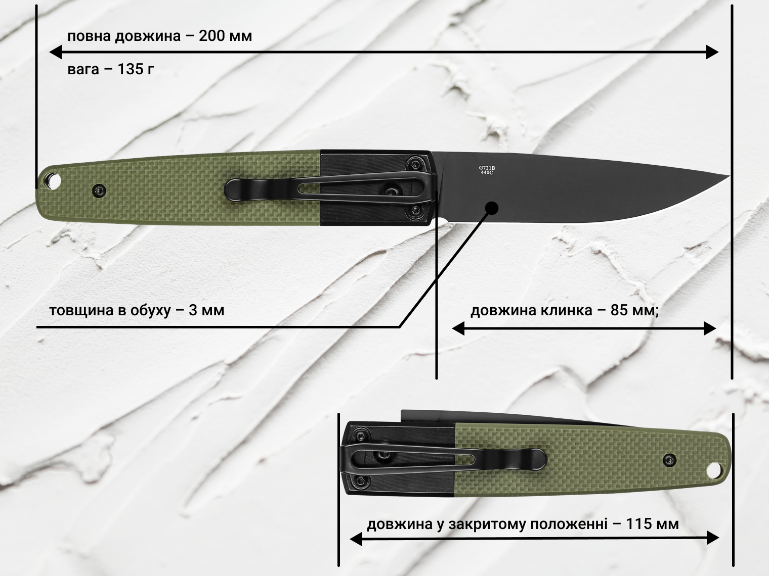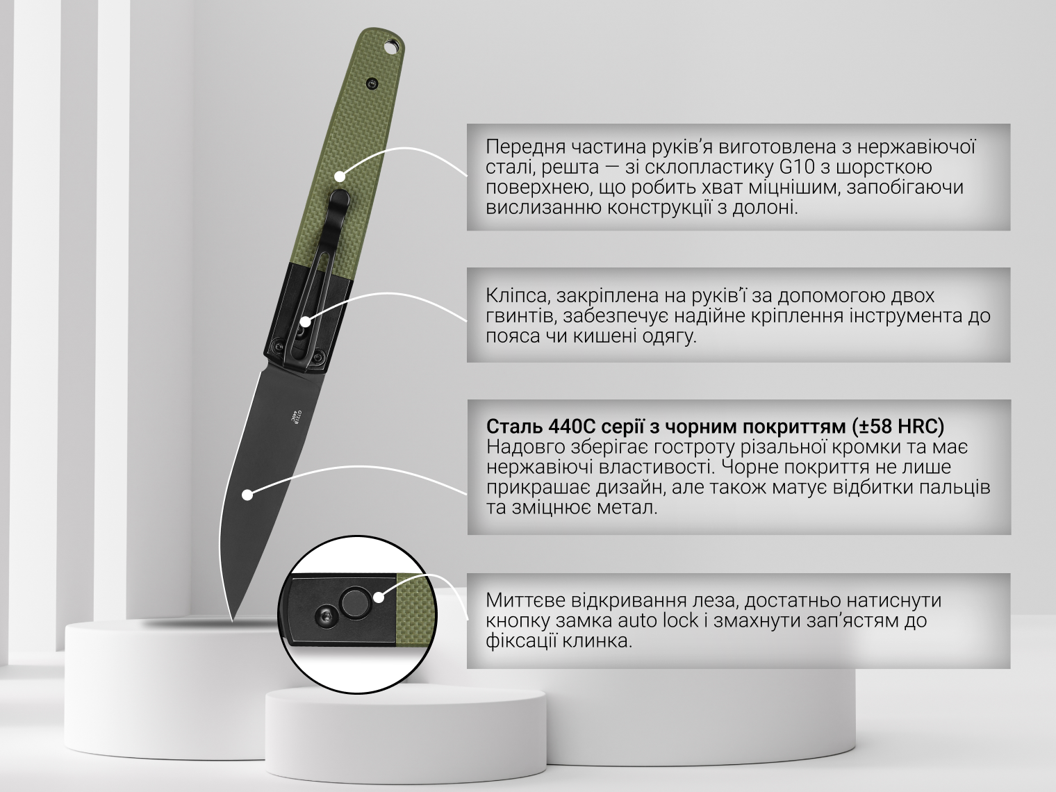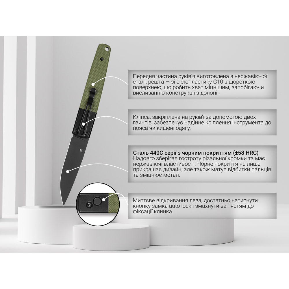 - клинок із нержавіючої марки сталі 440С (твердість ±58 HRC);