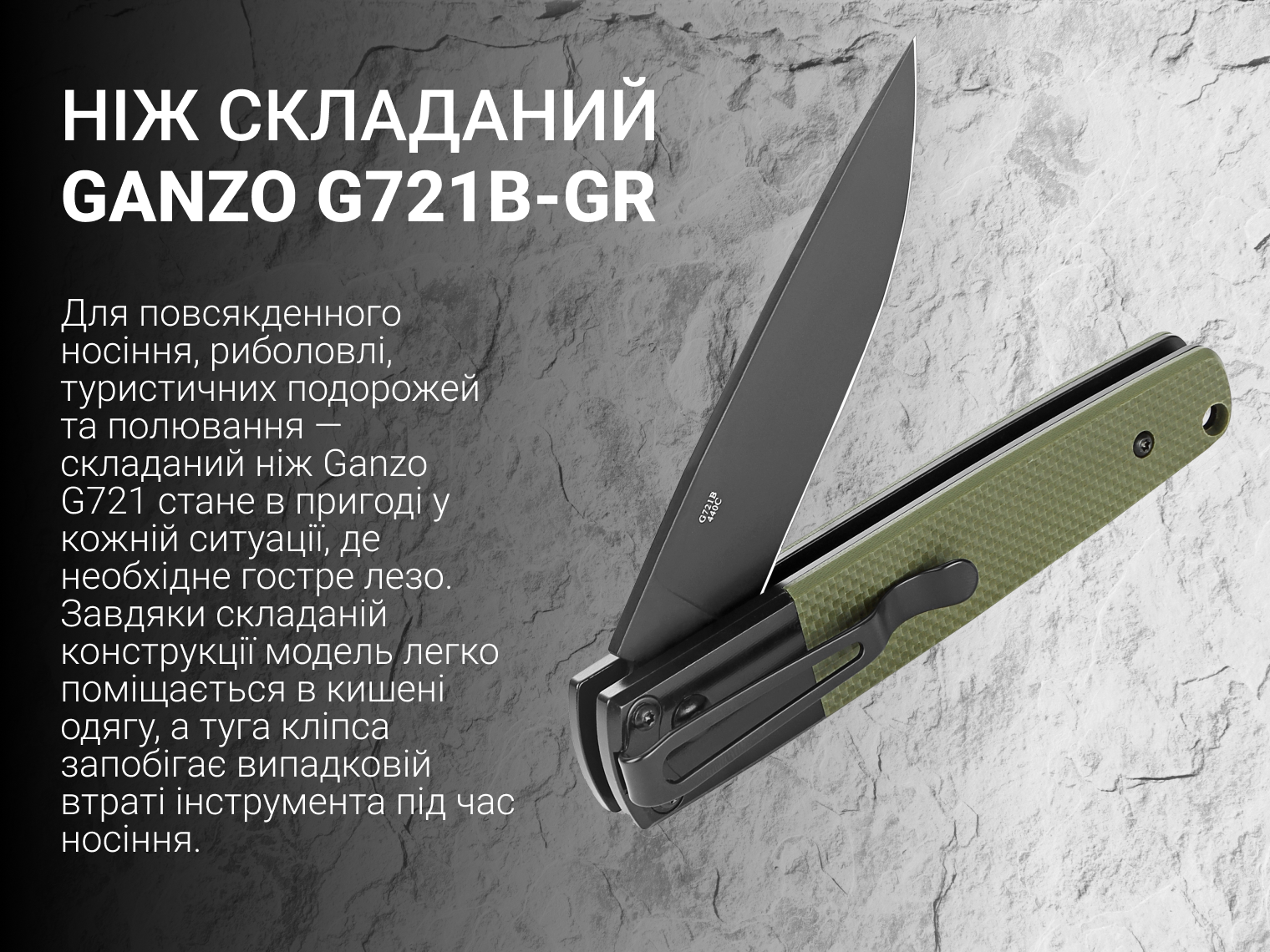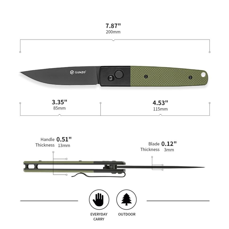 Для повсякденного носіння, риболовлі, туристичних подорожей та полювання — складаний ніж Ganzo G721 стане в пригоді в кожній ситуації, де необхідне гостре лезо. Завдяки складаній конструкції модель легко поміщається в кишені одягу, а туга кліпса запобігає випадковій втраті інструмента під час носіння.