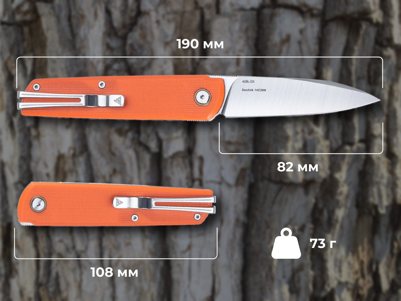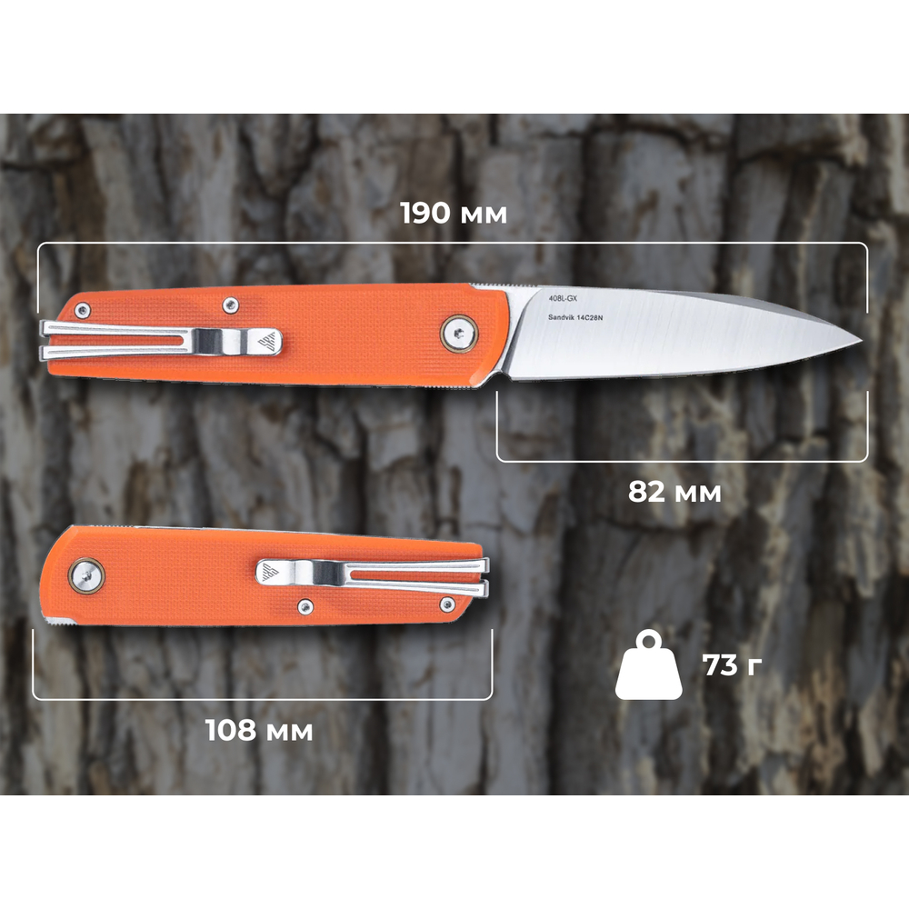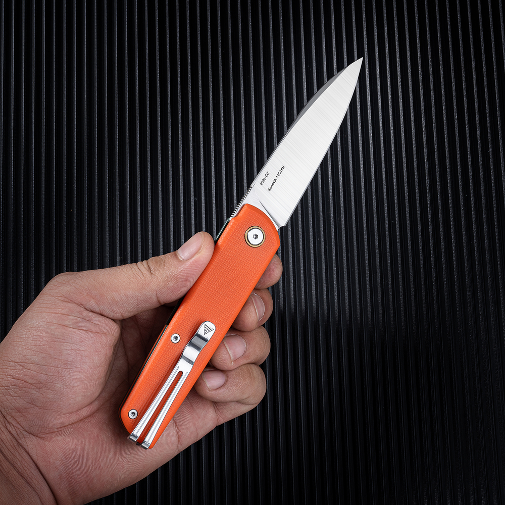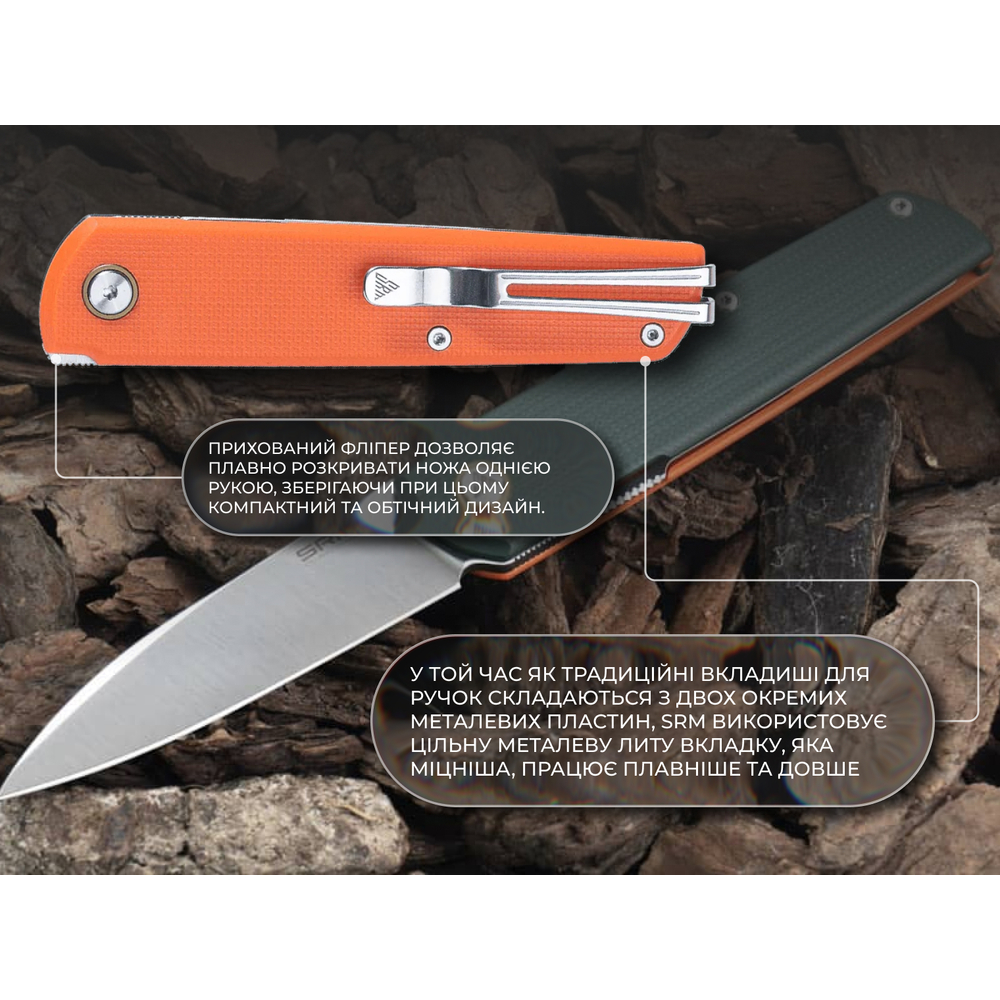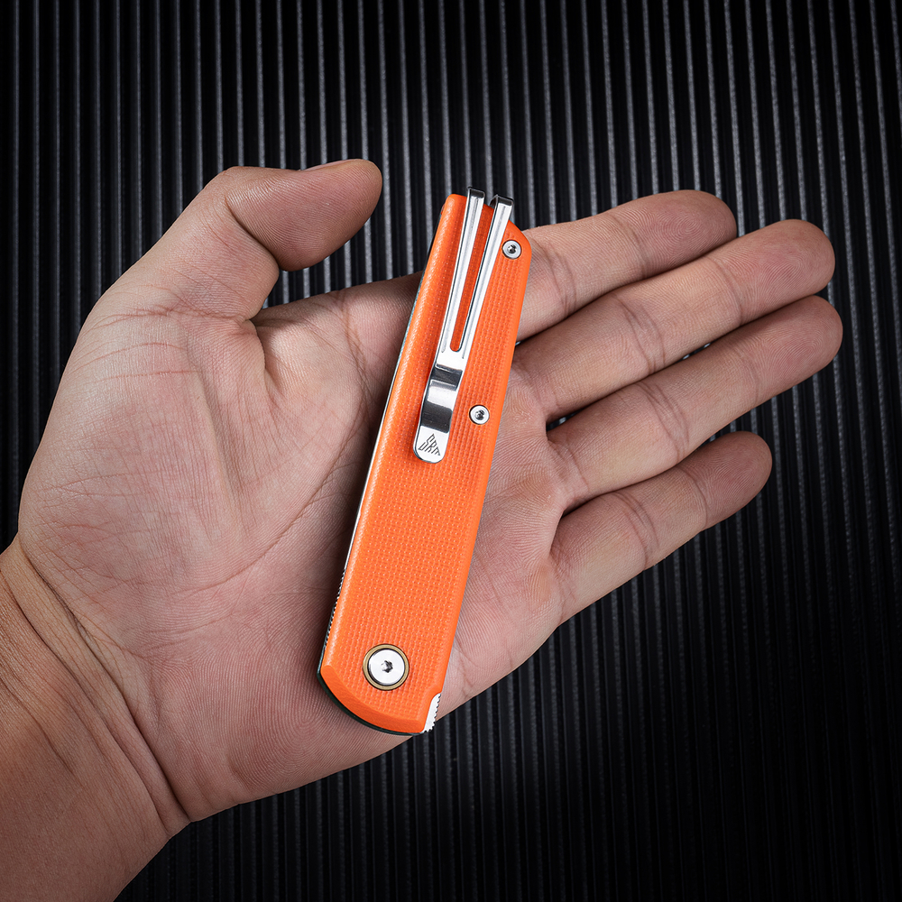 Візуально ніж 408L-GX від SRM має дуже акуратне оформлення: тонкий профіль та чисті лінії з акцентними плашками роблять посадку на кишені простою та зручною. Для фіксації передбачено фірмову кліпсу Ambi Clip з нержавіючої сталі — її можна встановлювати з будь-якого боку руківʼя без використання додаткових інструментів.