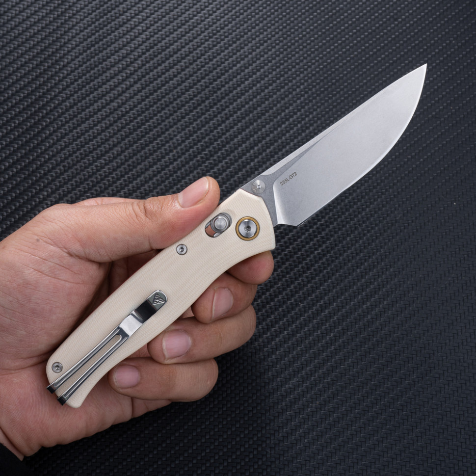 Для відкриття ножа достатньо натиснути одним пальцем на двосторонній шпеник, який однаково зручний для взаємодії правою та лівою рукою. Керамічні підшипники роблять рух леза плавним та передбачуваним.